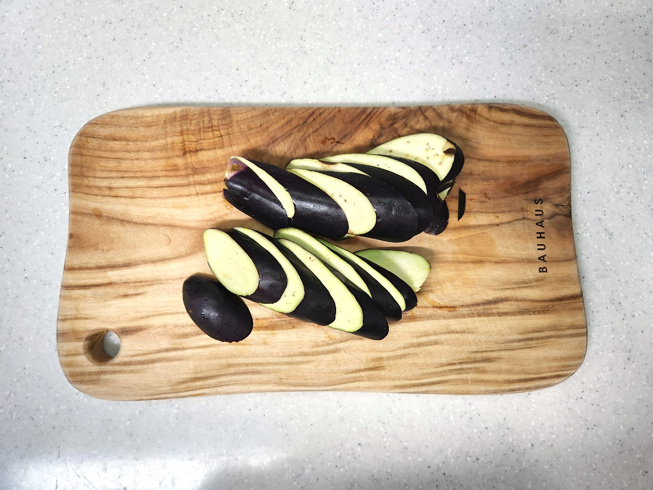 가지는 1cm 두께로 도톰하게 어슷썰어 주세요.