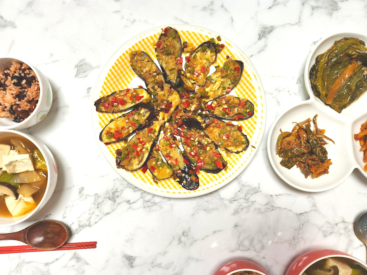 일반적인 가지 조림은 간장반 물반. 짭쪼름한 밥반찬을 위해 간장을 많이 넣은 양념장에 또 물을 붓고, 설탕으로 단짠단짠 간을 맞춘다음 오랜시간 조려낸 것이지만 저는 조금 달리해봤습니다. 간장의 양을 적게 넣고, 너무 짜지 않게 가지, 채소의 단맛과 수분만으로 요리해봤어요.