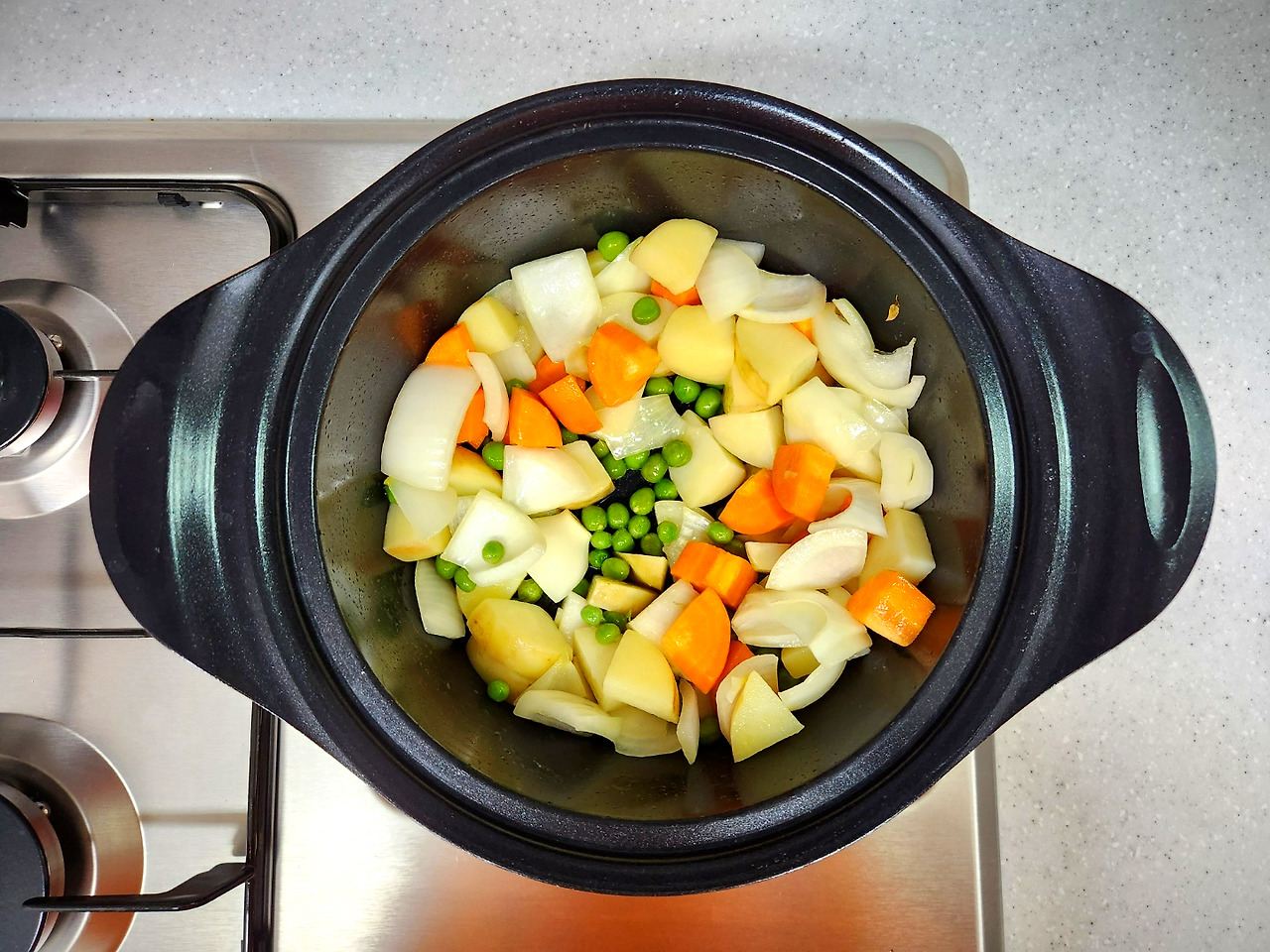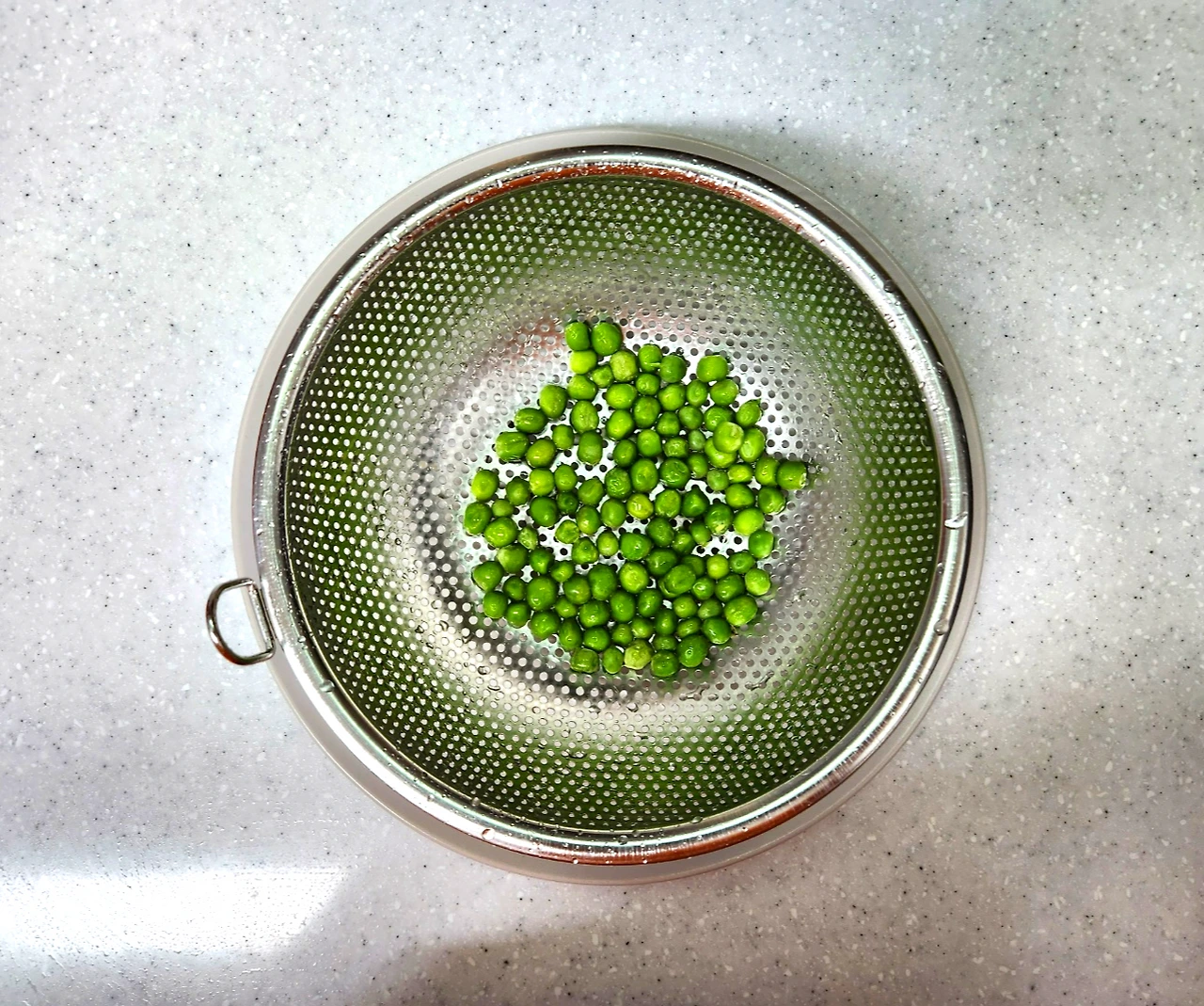 감자가 약간 투명해지면 찬물에 살짝 헹군 완두콩을 넣고 1~2분 간 볶아 줍니다.
