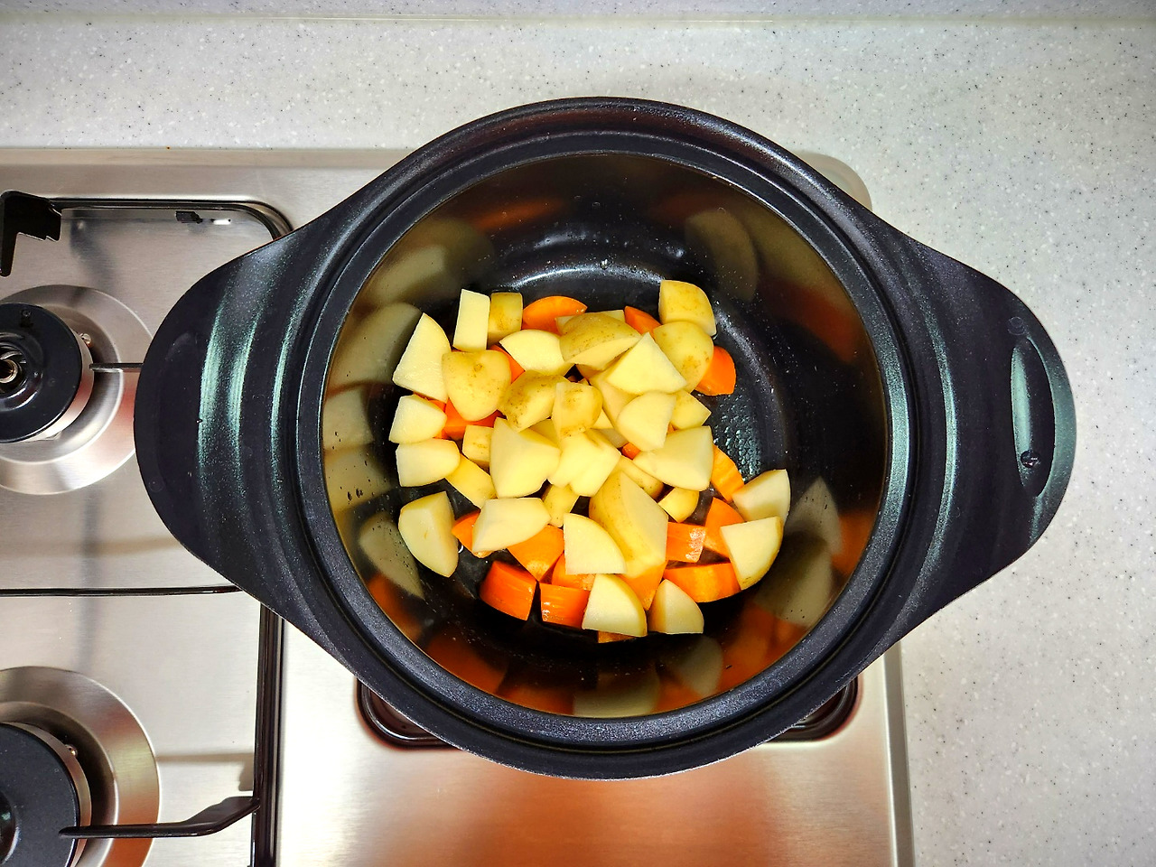 냄비에 올리브유를 두르고 당근을 충분히 볶아 준 다음 감자를 넣고 함께 볶아줍니다.