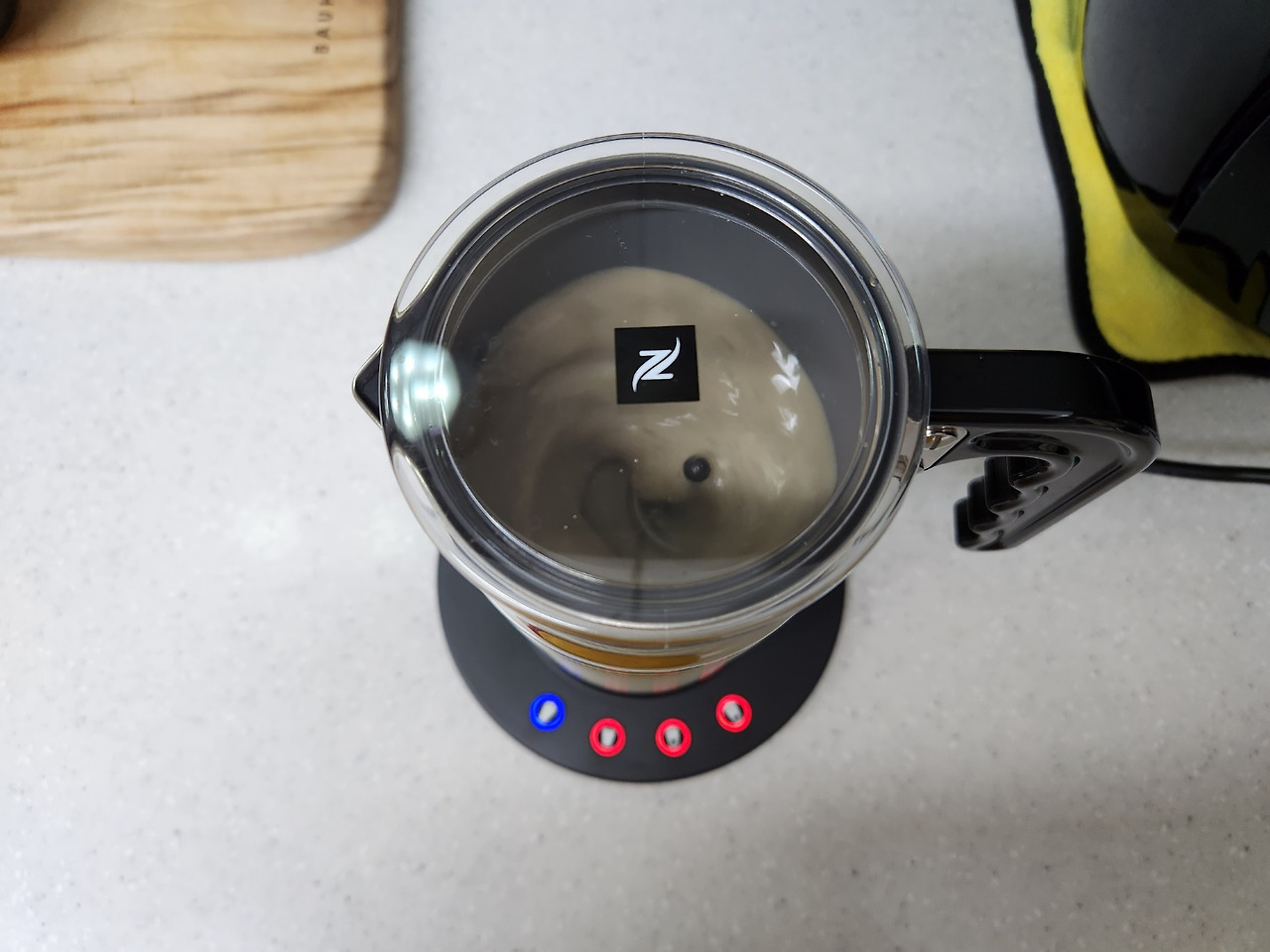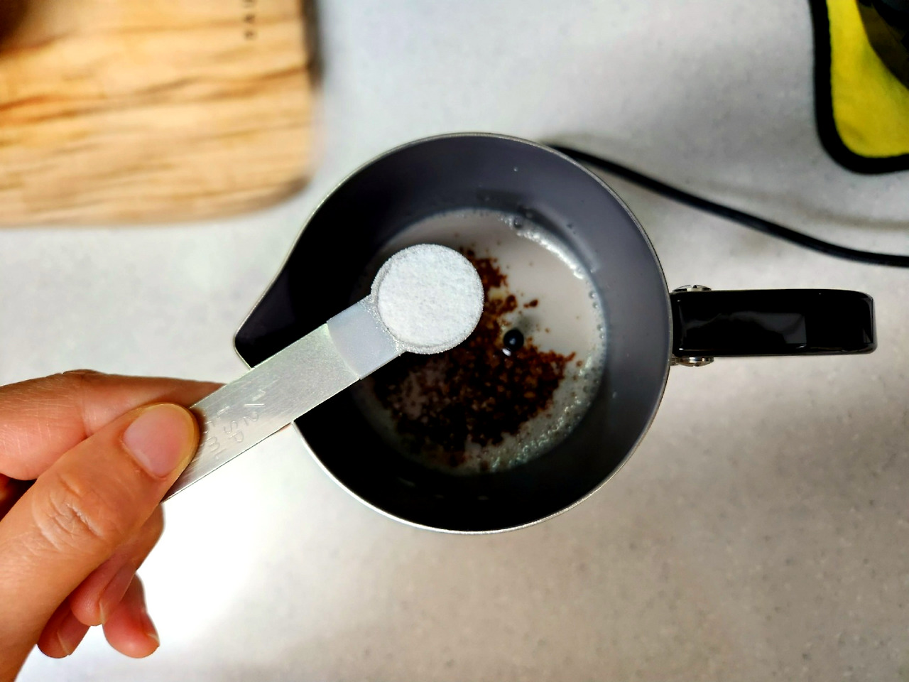 전동스팀기에 나머지 두유(120ml), 인스턴트 커피(알커피), 스테비아를 넣고 섞어 주세요.
