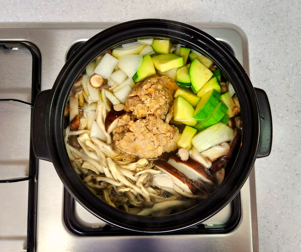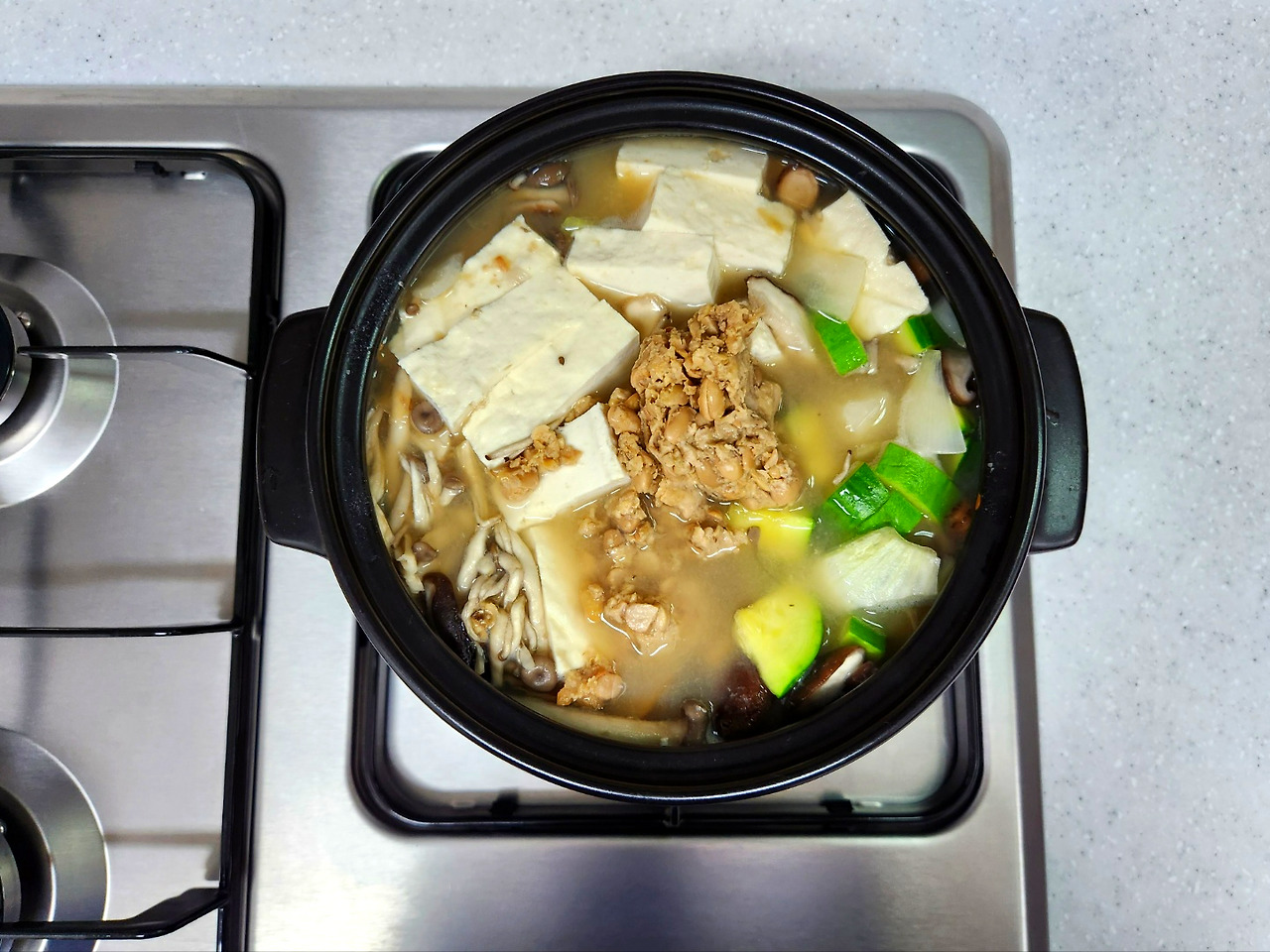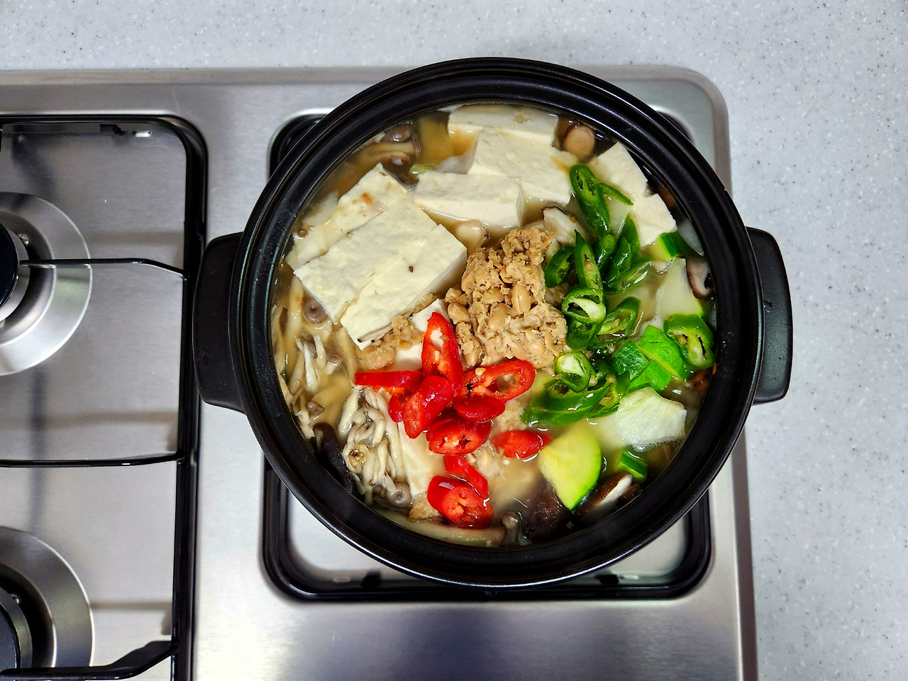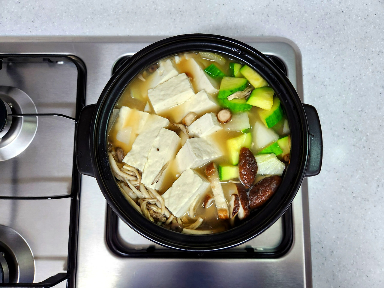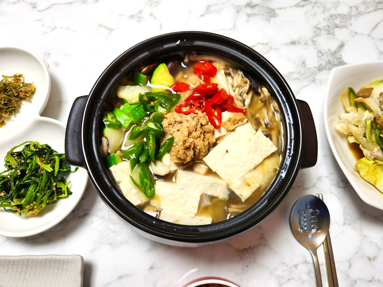 다시마의 글루타민산나트륨과 표고의 구아닐산이 만나 감칠맛이 배가됩니다. 국물만으로도 맛있는 비건 청국장! 채소 육수만으로도 충분해요.