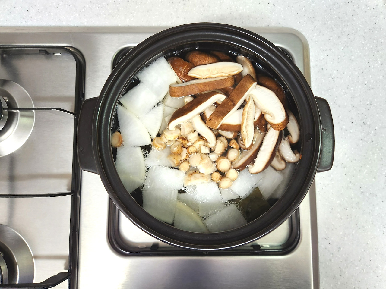 나박썰기한 무를 넣고 표고버섯을 먹기 좋은 크기로 썰어 충분히 국물을 우려냅니다.