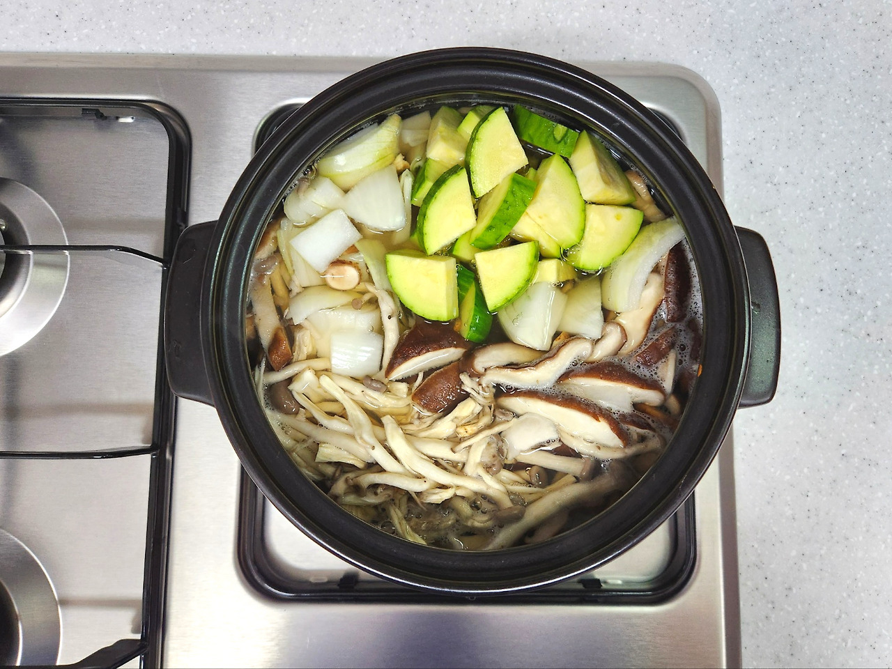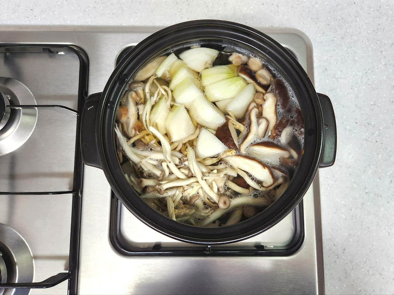 다시마를 건져 내고 느타리버섯, 양파를 넣습니다.