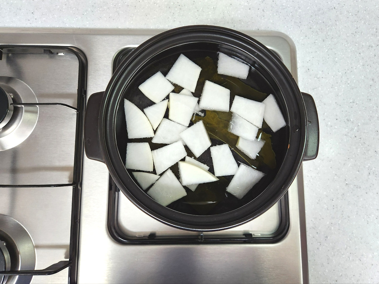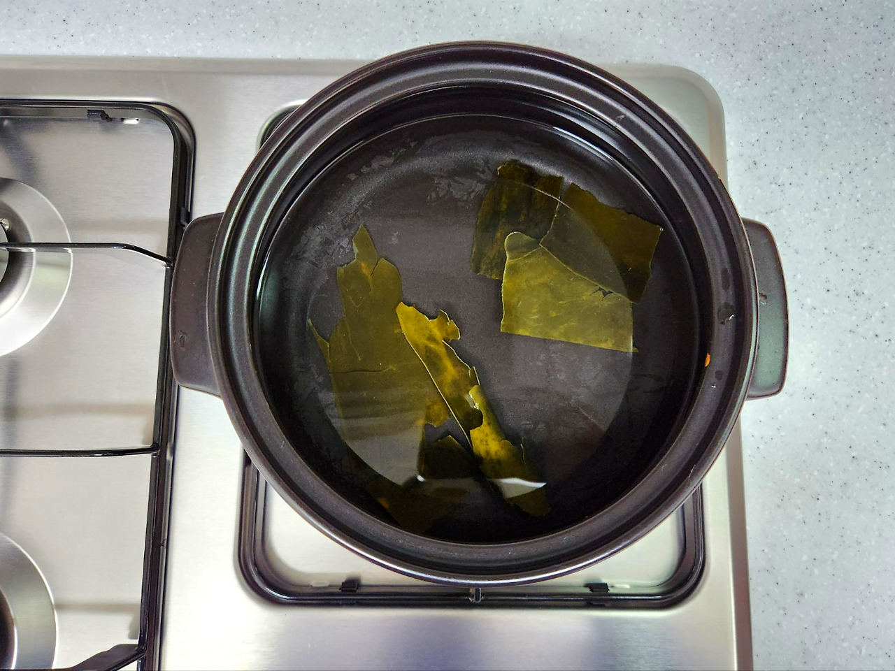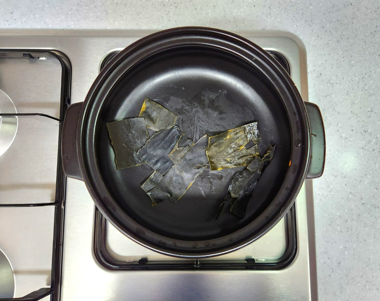 달궈진 냄비에 다시마를 살짝 구운 다음 물 500ml를 붓습니다.