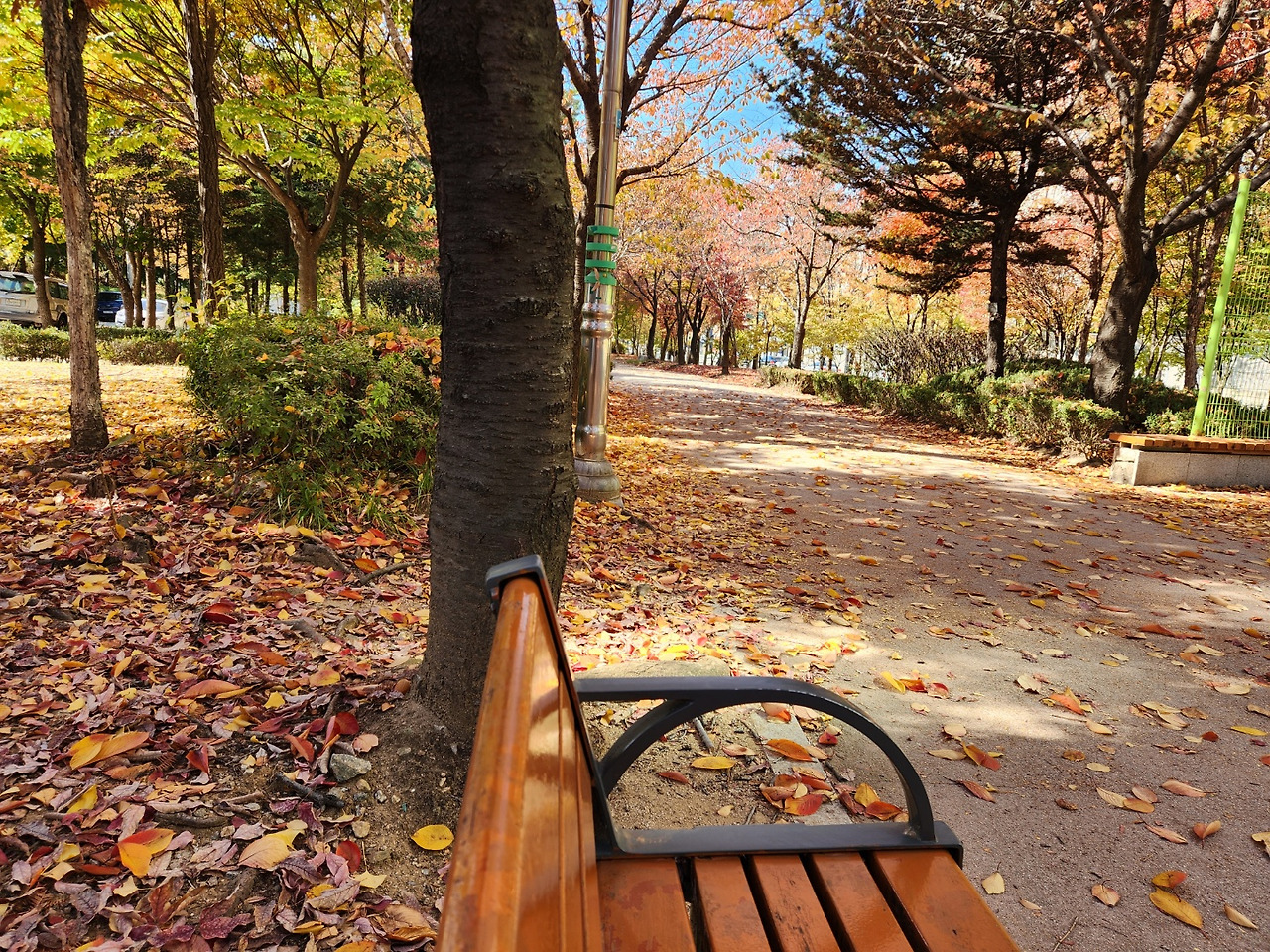 며칠 전에도 그렇게 곱게 물든 단풍과 낙엽들을 바라보면서 남편과 커피를 마시고 있었다. 날이 갑자기 추워지면서 도톰한 옷을 껴입은 날, 아침 기온은 무려 0도. 우리가 공원을 나섰을 땐 10도 이하를 밑돌고 있어서 이제 곧 초겨울이겠구나 생각했는데 갑자기 낯선 손 하나가 꼬고 있던 다리 안으로 쑥 들어왔다.