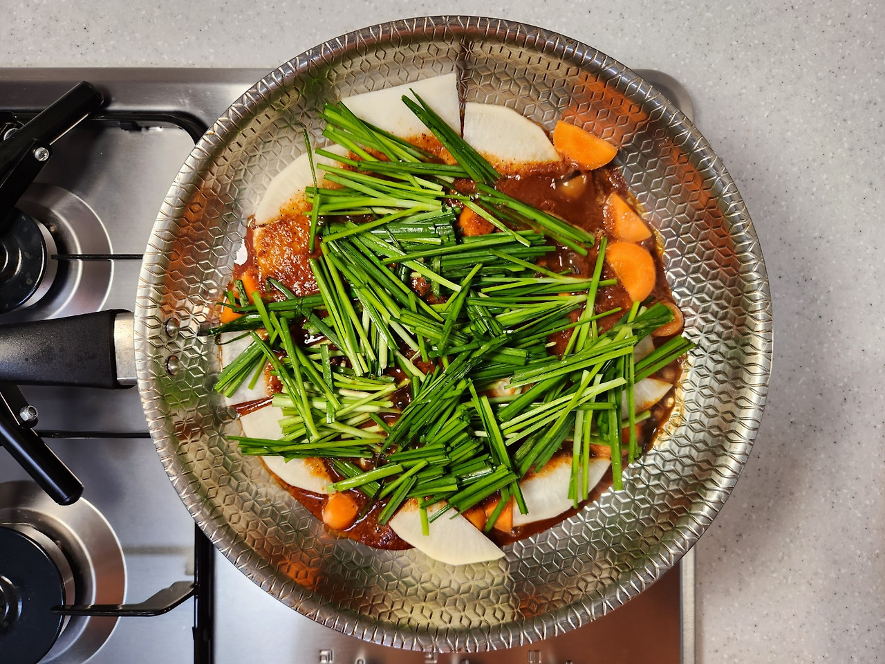 무 200g, 당근 100g 을 1cm 두께로 썰어 밑바닥에 깔고 여기에 양념장을 2/3정도 부은 다음 부추 100g을 올린다. 10분 정도 중불에서 조린다음 무김치 200g, 냉동고등어 250g을 얹고 여기에 남은 양념장을 뿌린다. 10분 정도 중불에서 조리다가 마지막에 부추 100g를 넣고 10분 정도 약불에서 은근히 조려주면 외할머니표 고등어조림 완성.