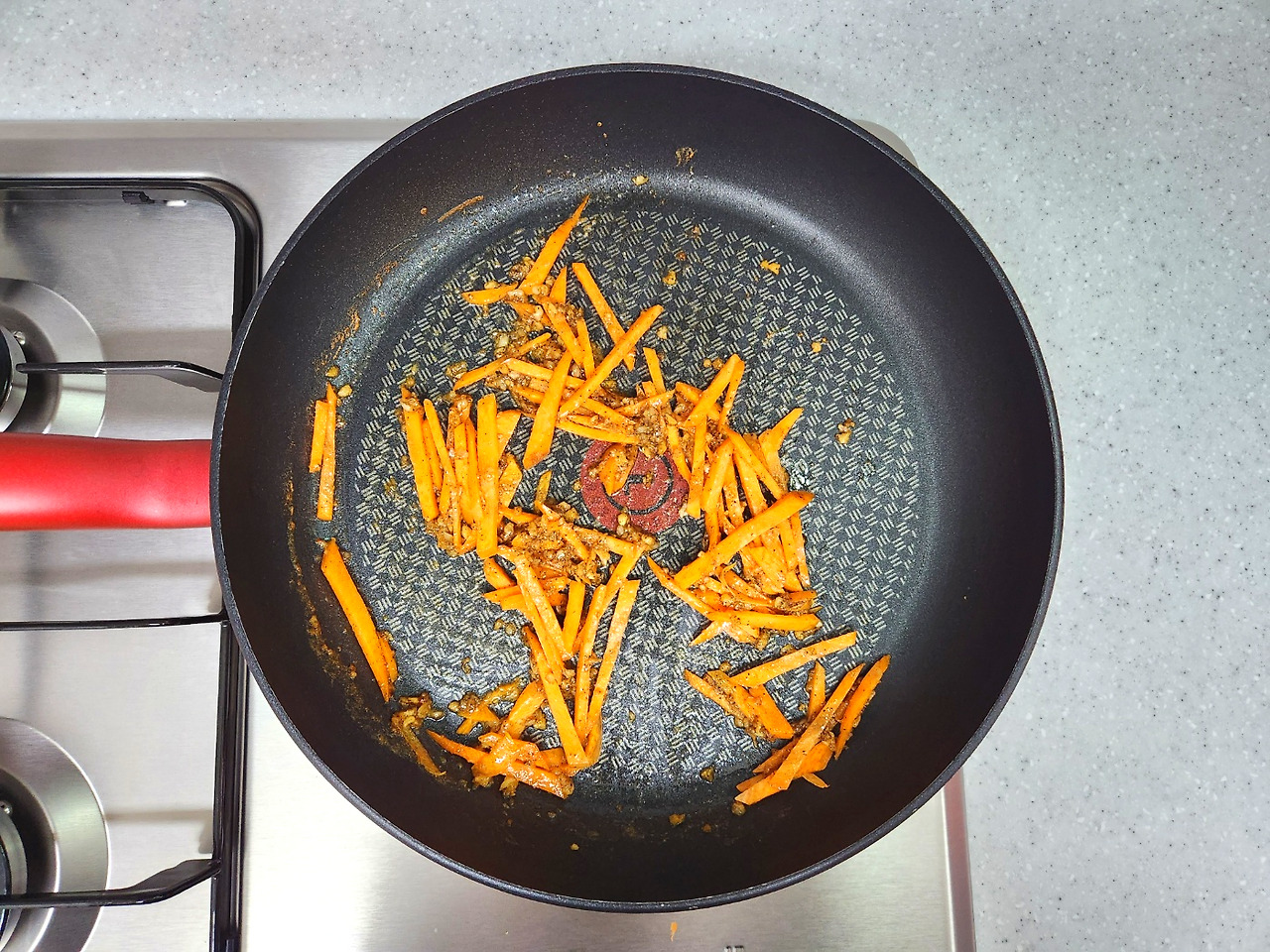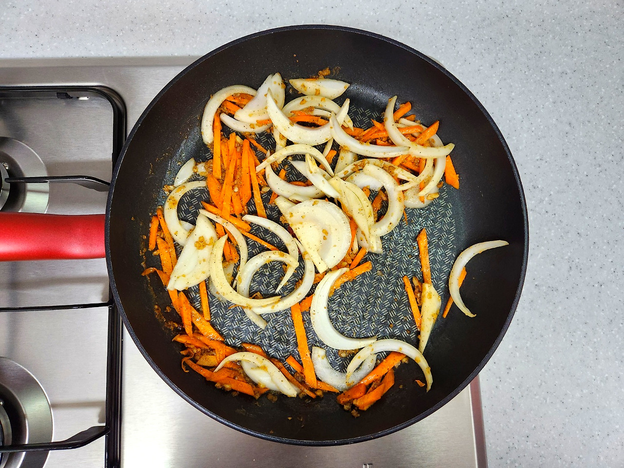 고소한 향이 올라오면 당근을 넣어 살짝 익힌 다음 양파를 볶습니다.