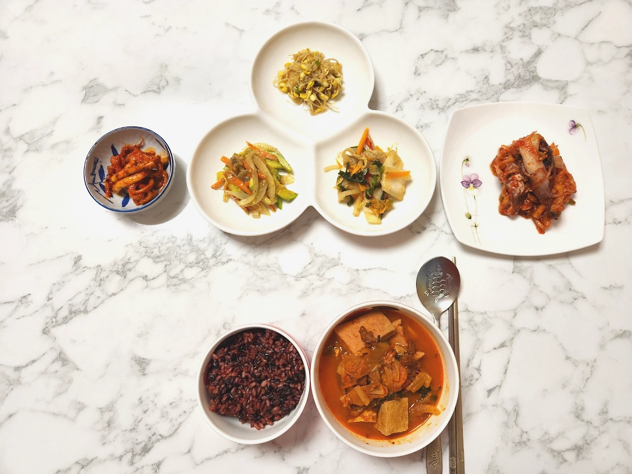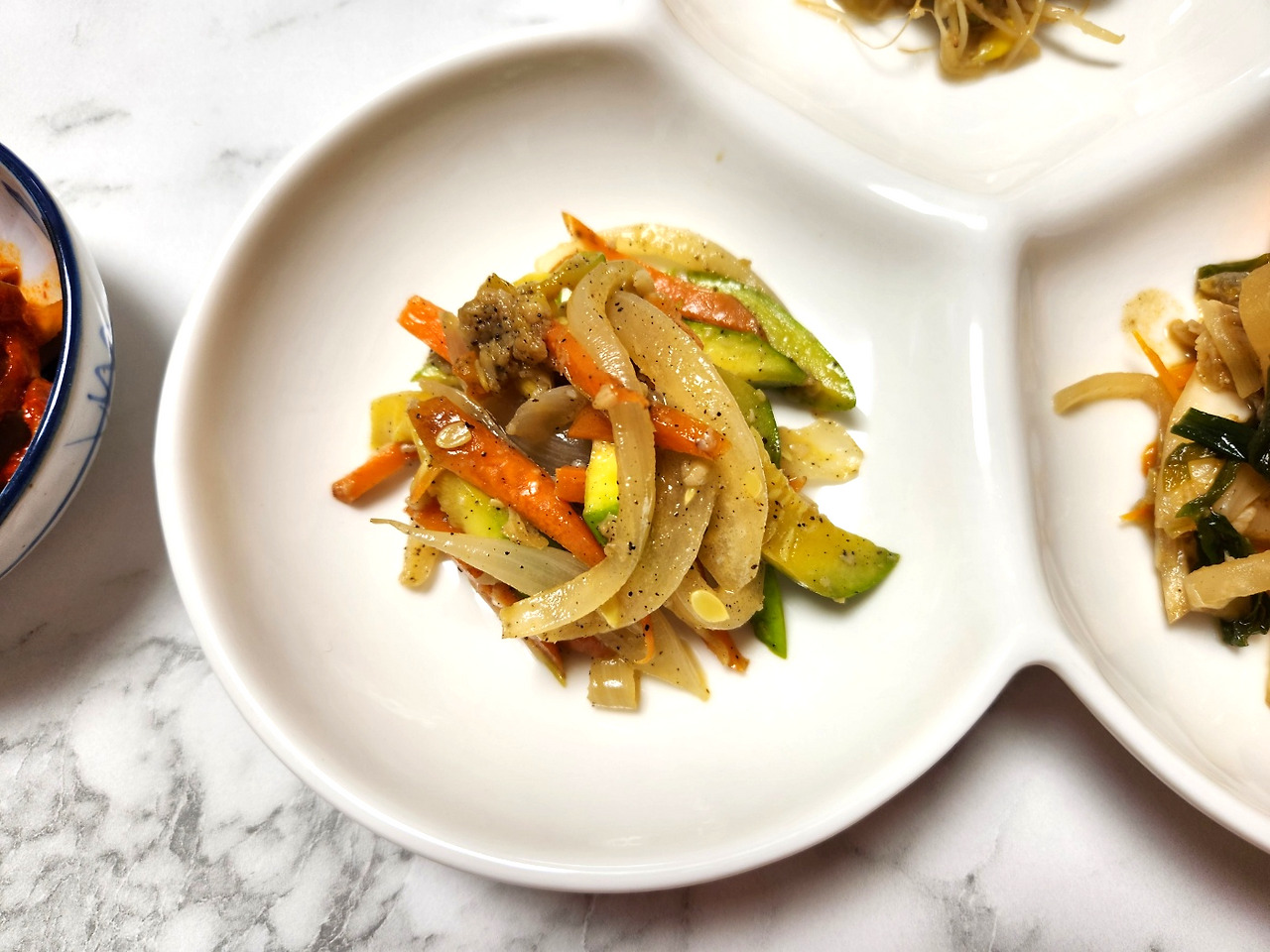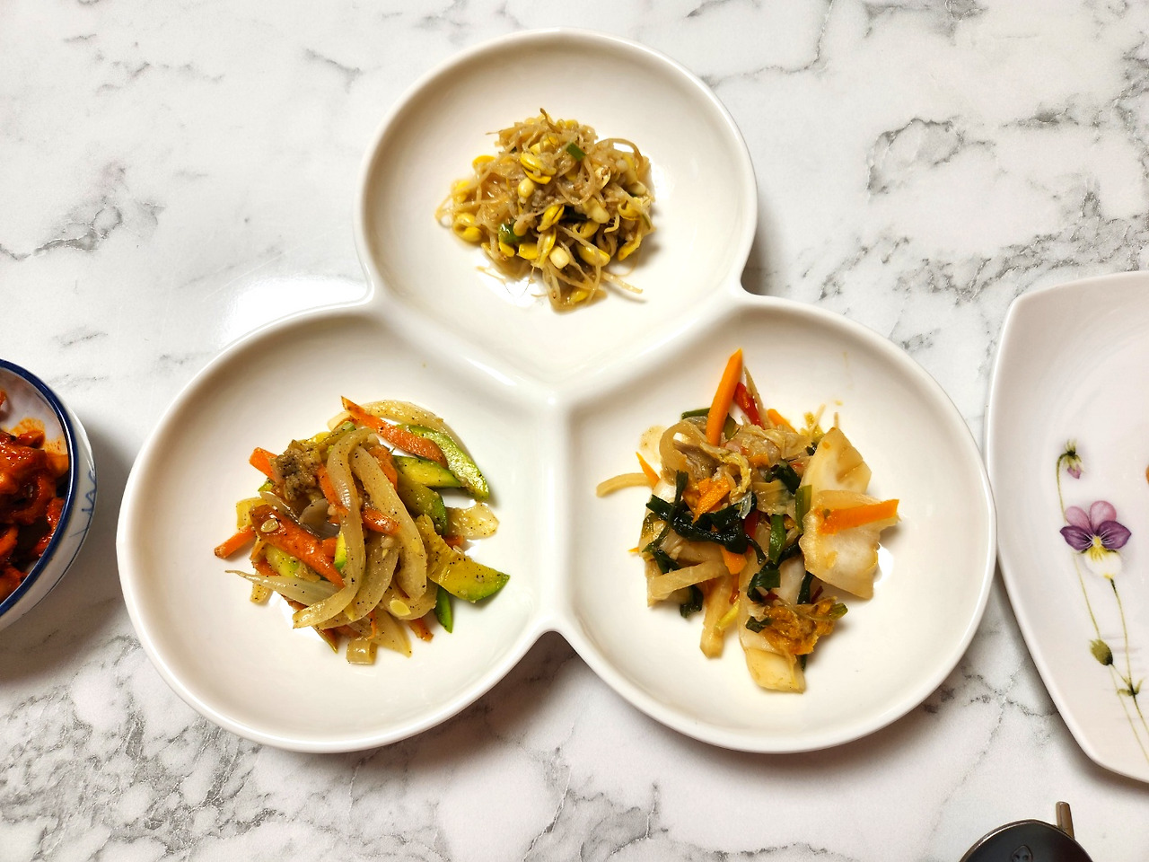 집에서 후딱 차려낸 3가지 반찬입니다. 콩나물볶음, 애호박나물 그리고 오른쪽에 있는 건 지난번 담근 된장김치인데 참기름 넣고 살짝 무쳐줬어요.