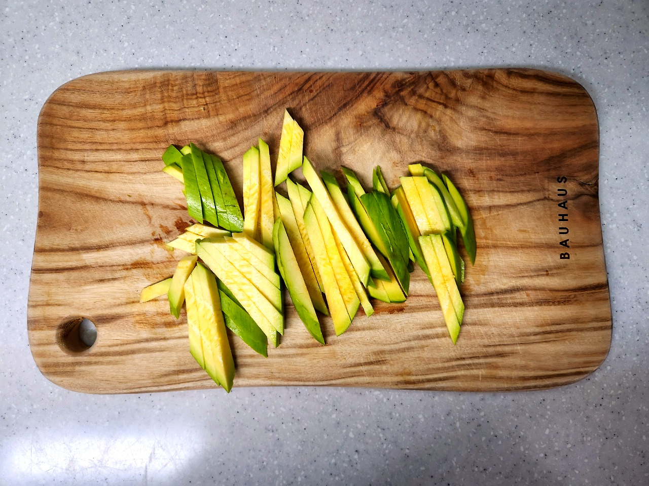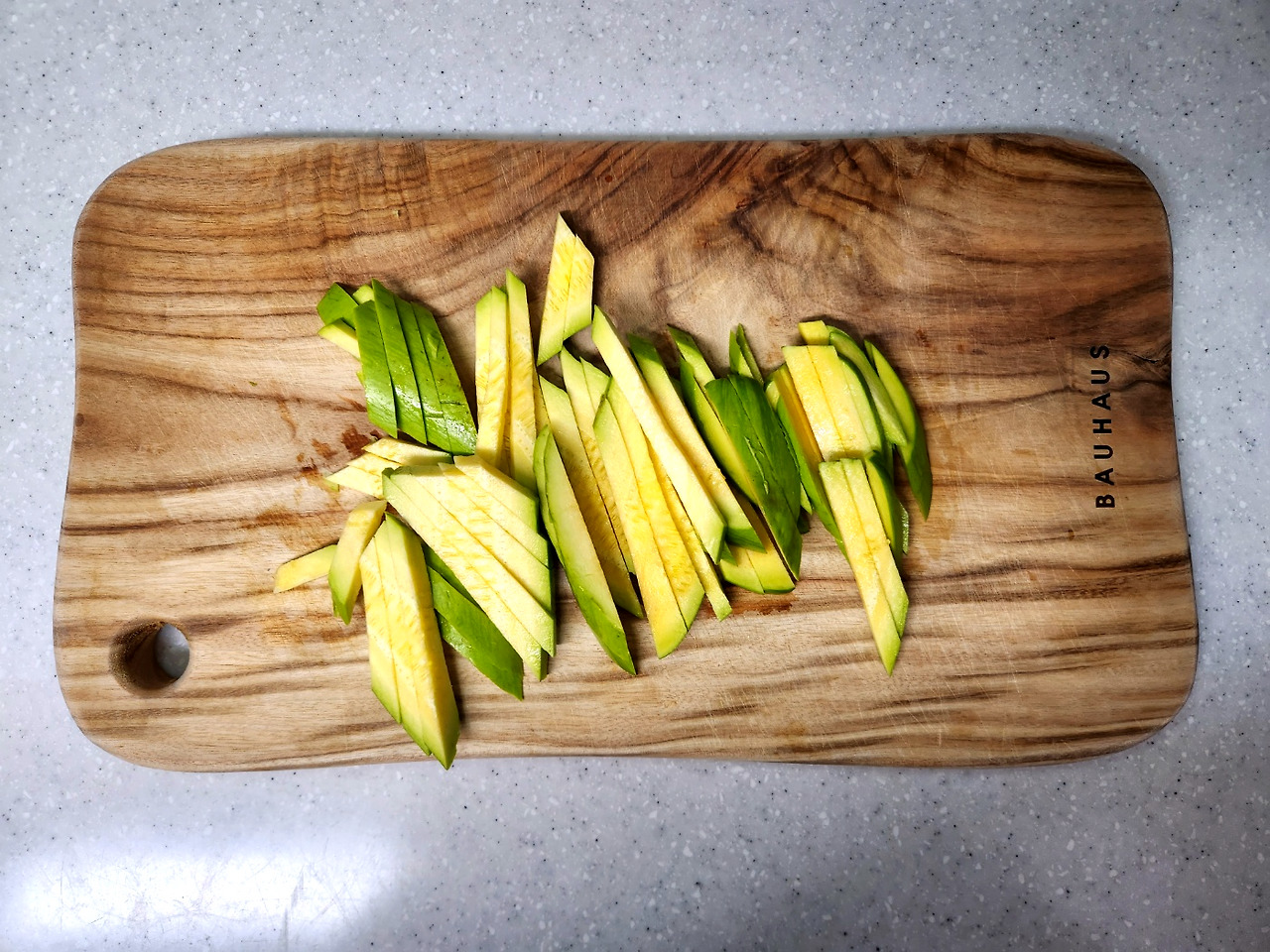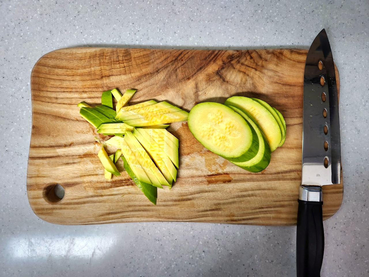 애호박은 0.7cm정도로 도톰하게 어슷썬 다음 같은 두께로 채썰어 주세요.