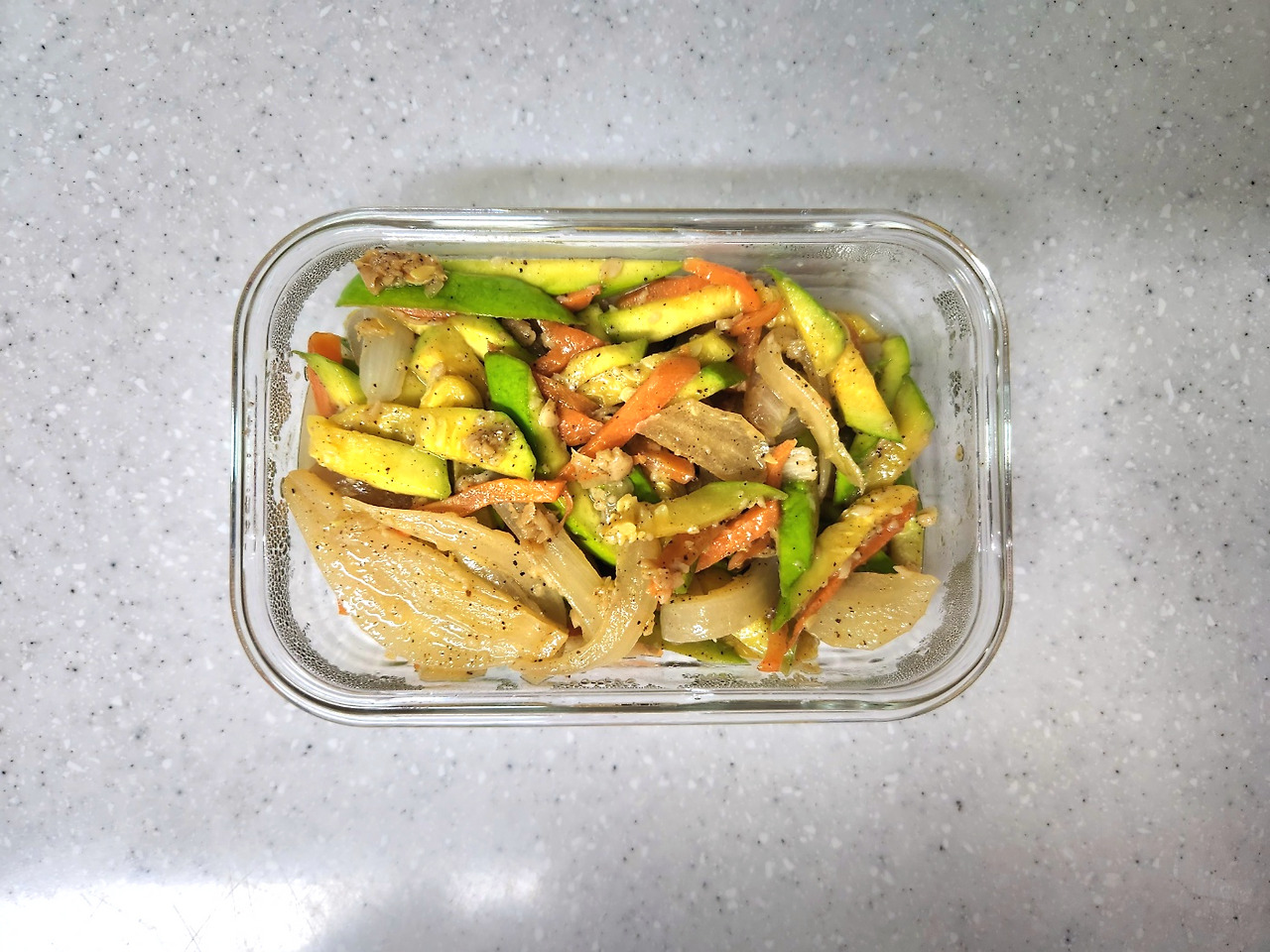 애호박은 0.7cm정도로 어슷썰어서 무채 썰 듯 길쭉하게 썰어주면 집어 먹기도 좋고 쉽게 물러지지도 않는답니다. 간은 저염간장 1T로 짜지 않게 하고, 설탕은 넣지 않는 대신 애호박에서 우러나오는 단맛과 양파, 당근을 채썰어 자연스런 단맛을 낼겁니다.