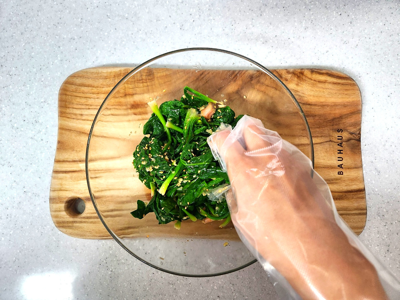 (시금치 무칠 땐 주물럭거리지 말고 속 안에 있는 시금치를 바깥으로 꺼내 듯 가라 앉아 있는 양념에 무쳐주세요.)