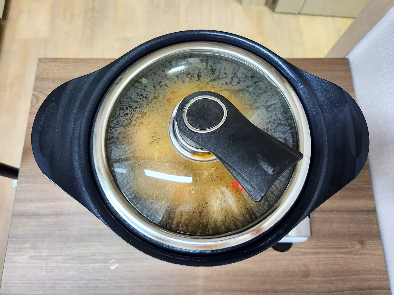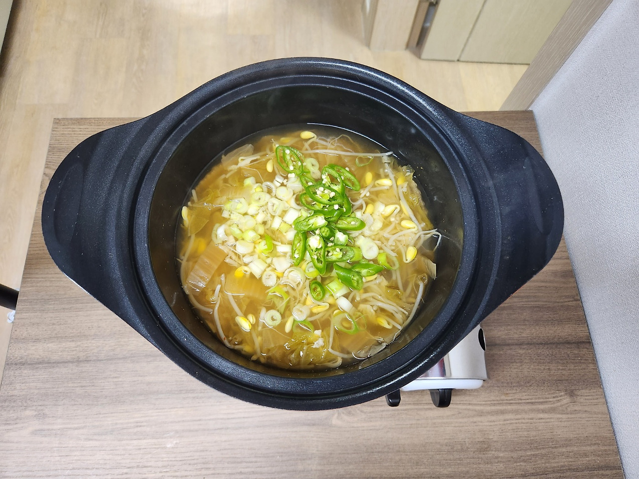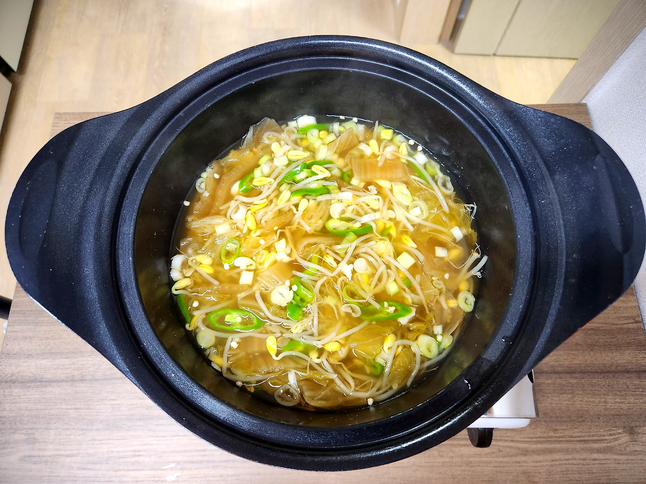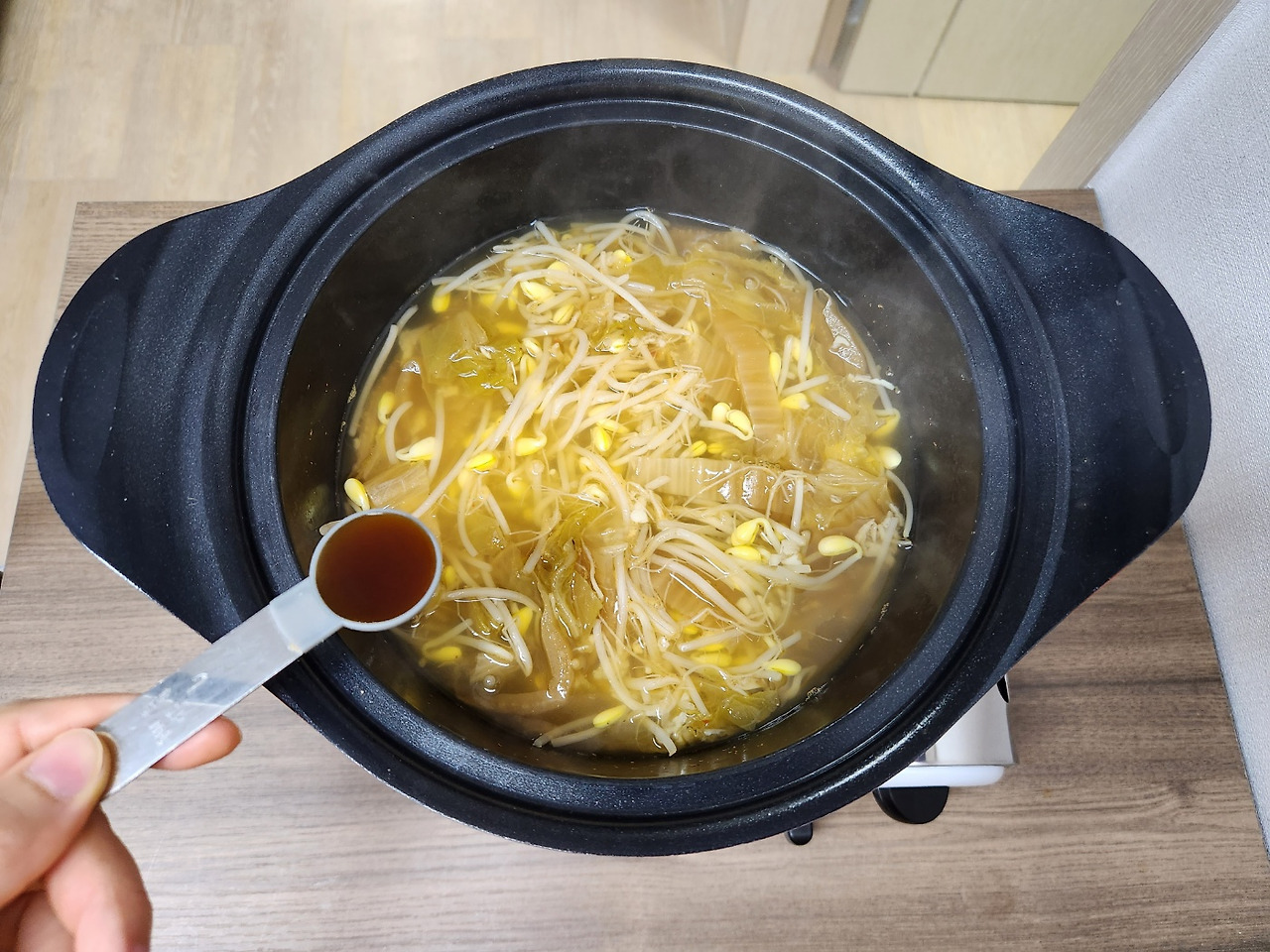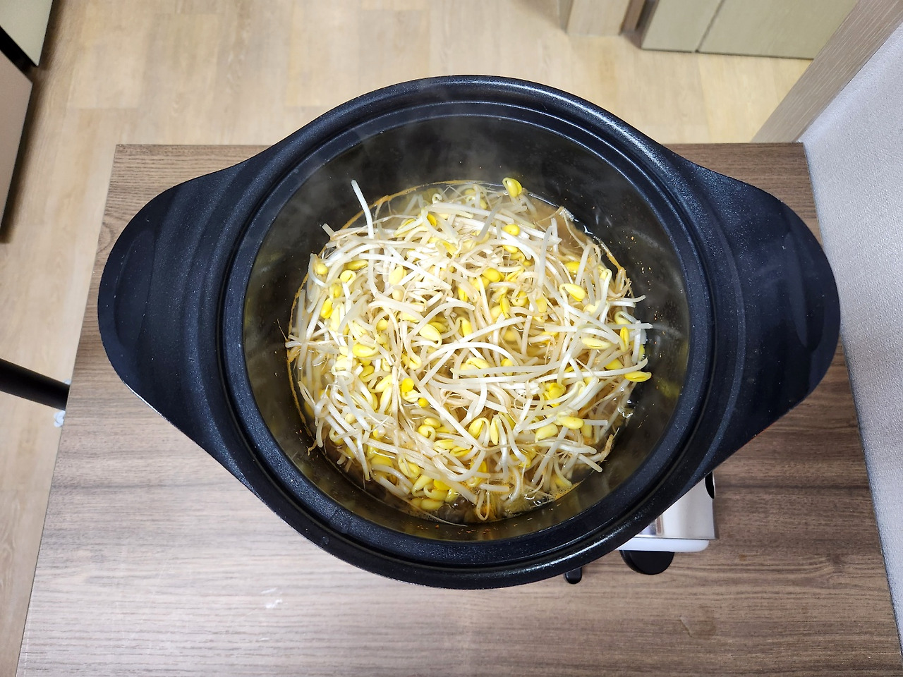 묵은지 맛이 국물에 우러나면 콩나물을 넣고 강불에서 5분 간 끓여주세요.