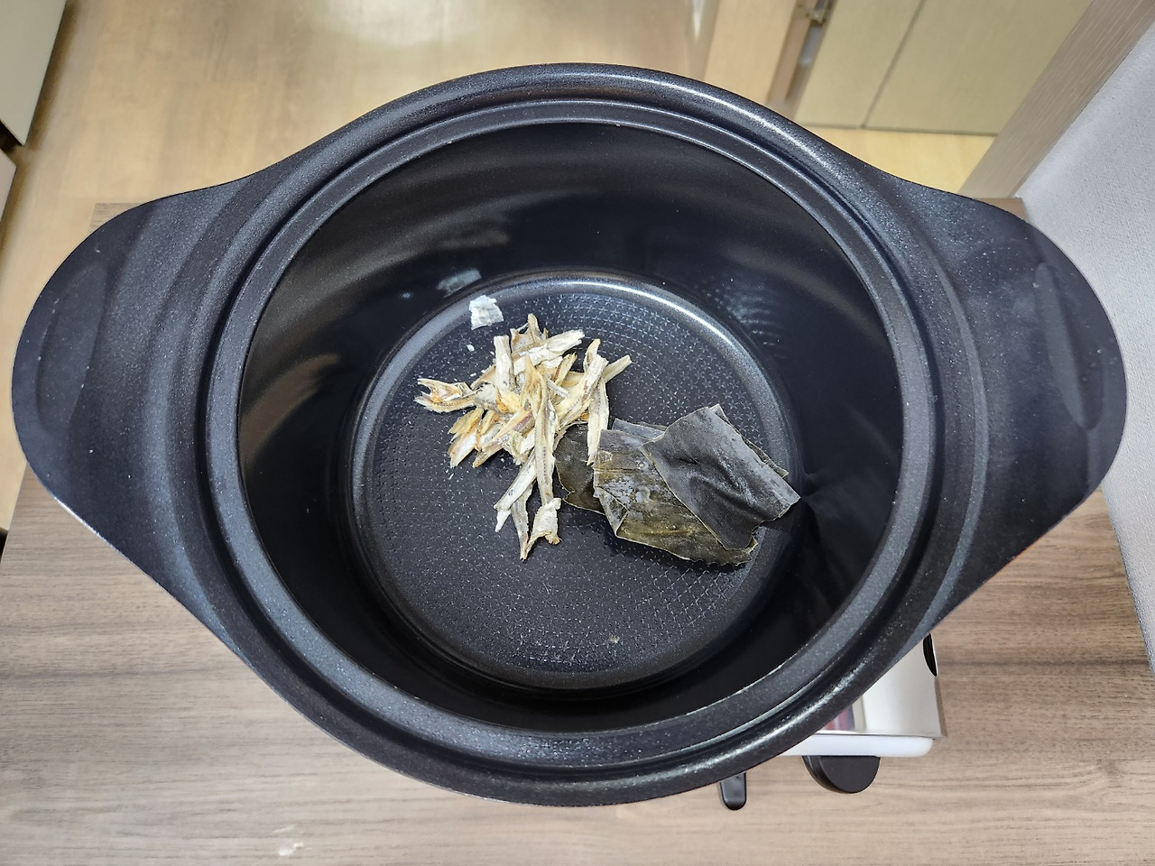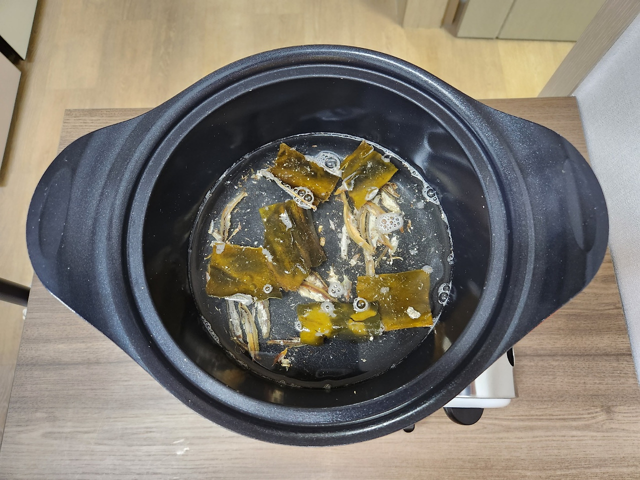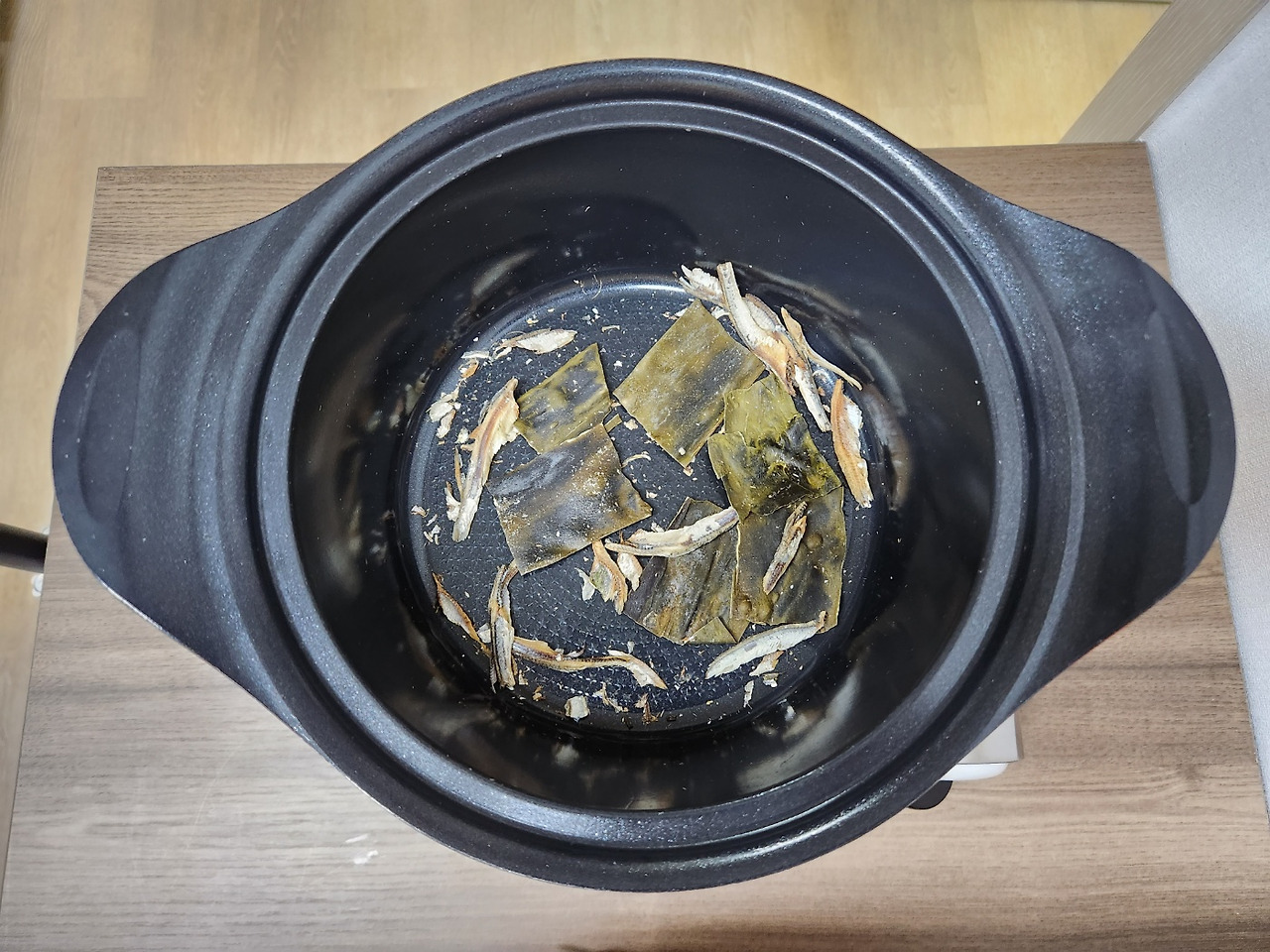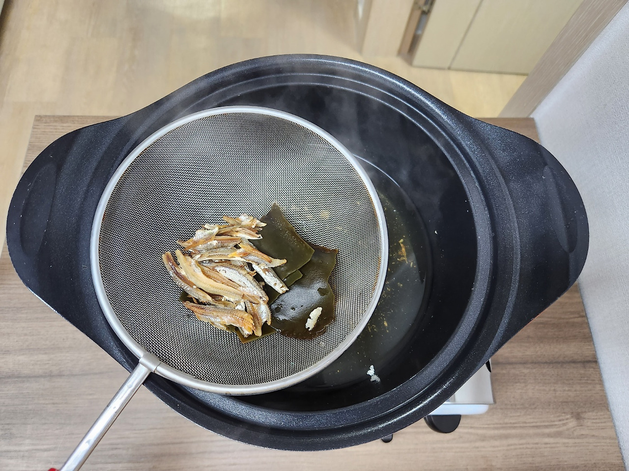 똥과 머리를 제거한 멸치는 다시마와 함께 약불에서 익혀줍니다.