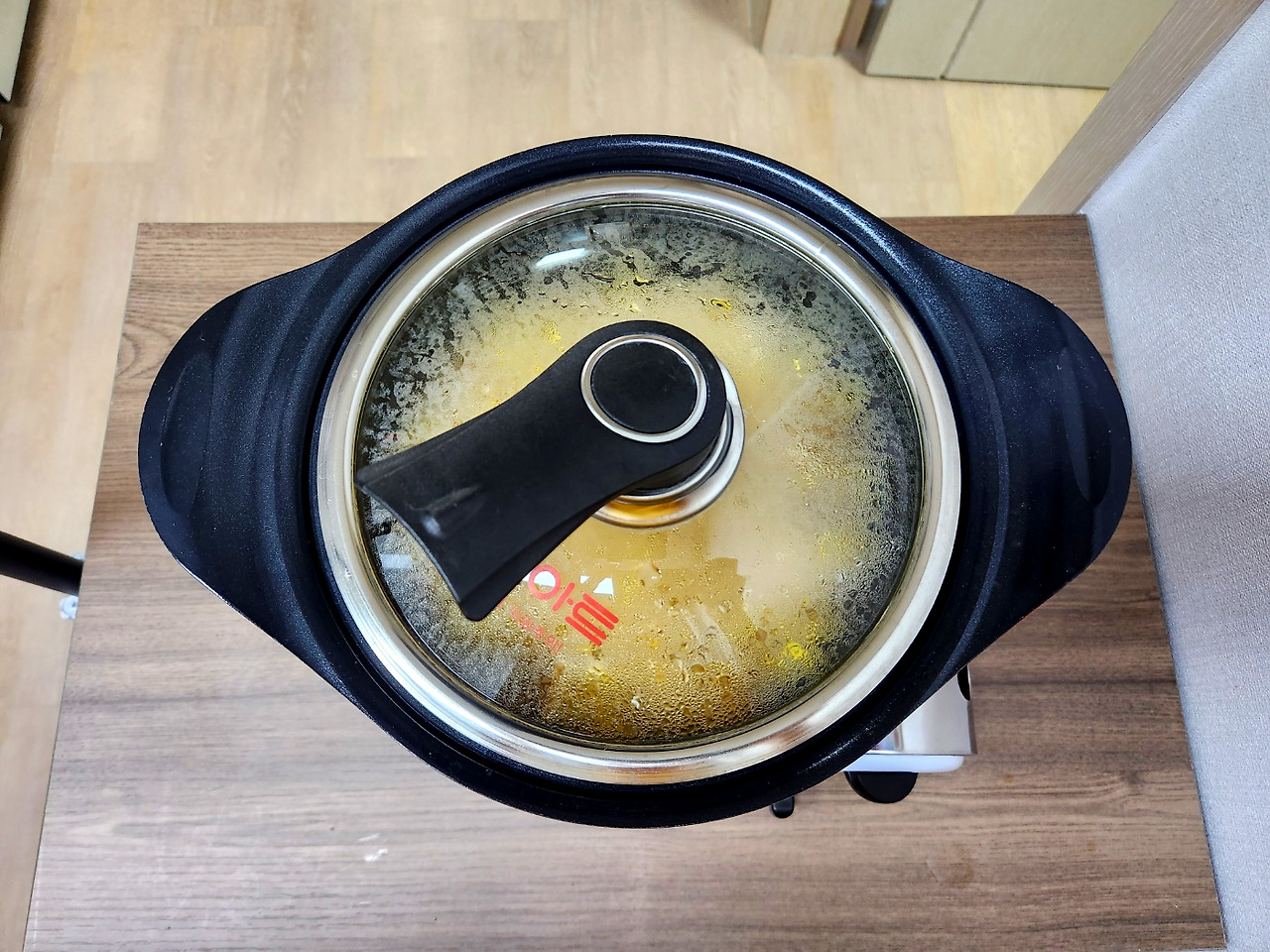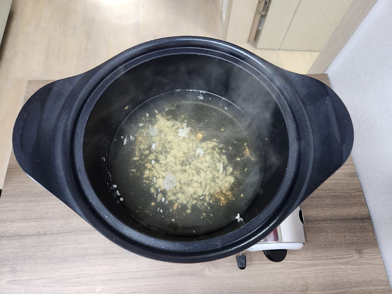 푹 끓인 다음 멸치와 다시마를 제거한 뒤 마늘을 넣습니다.