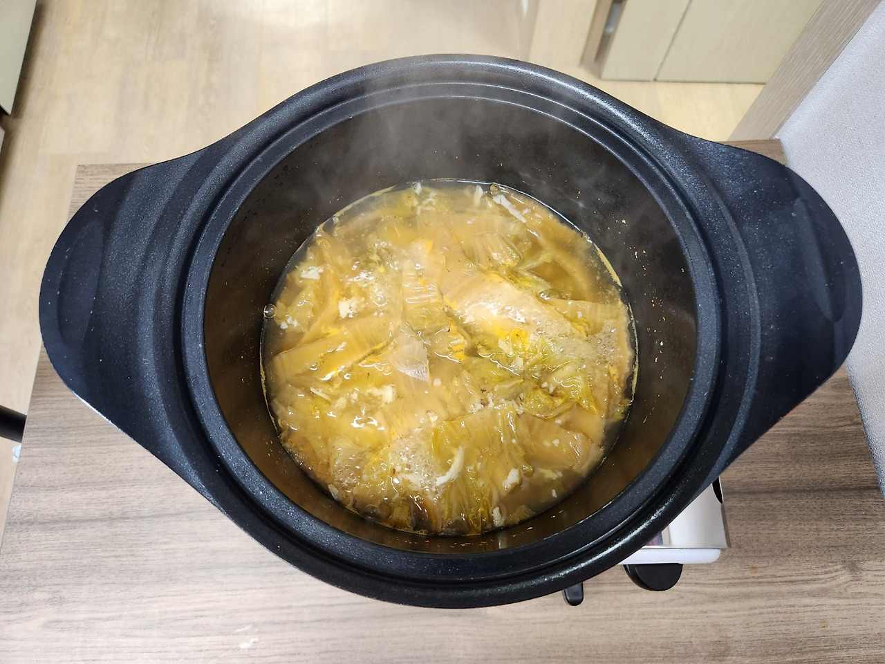 묵은지를 넣고 10분 동안 팔팔 끓여주세요.