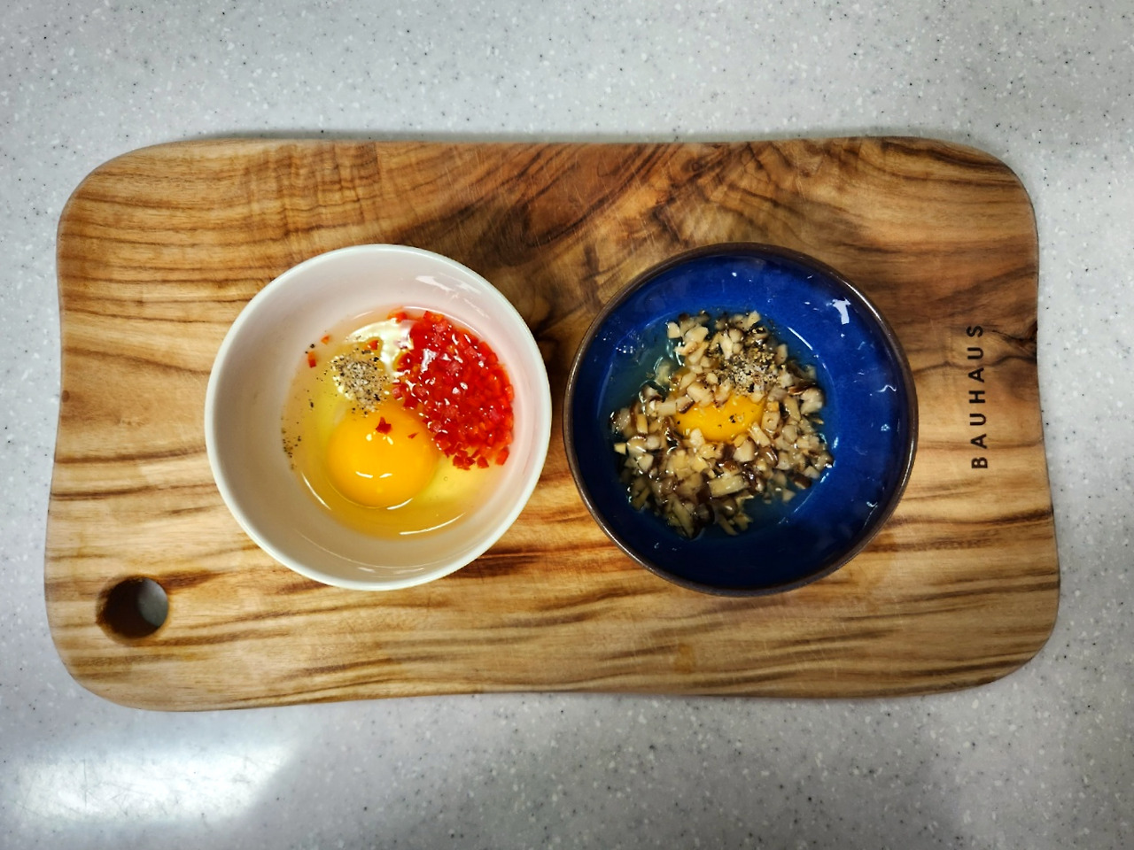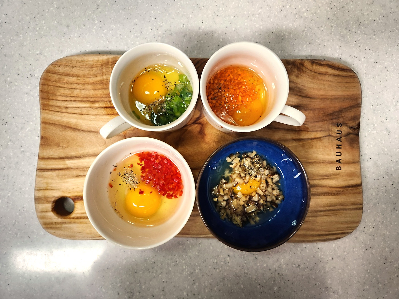 작은 컵이나 공기에 달걀 1개씩 넣은 후 각각 다른 채소를 넣어주세요. 허브솔트 1/4t도 4군데에 나누어 넣습니다.