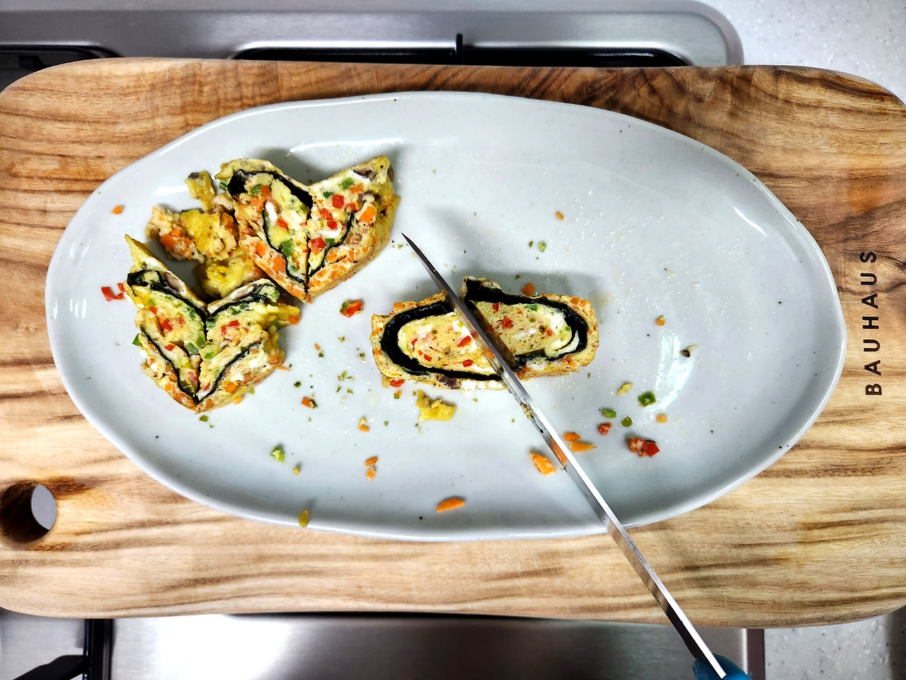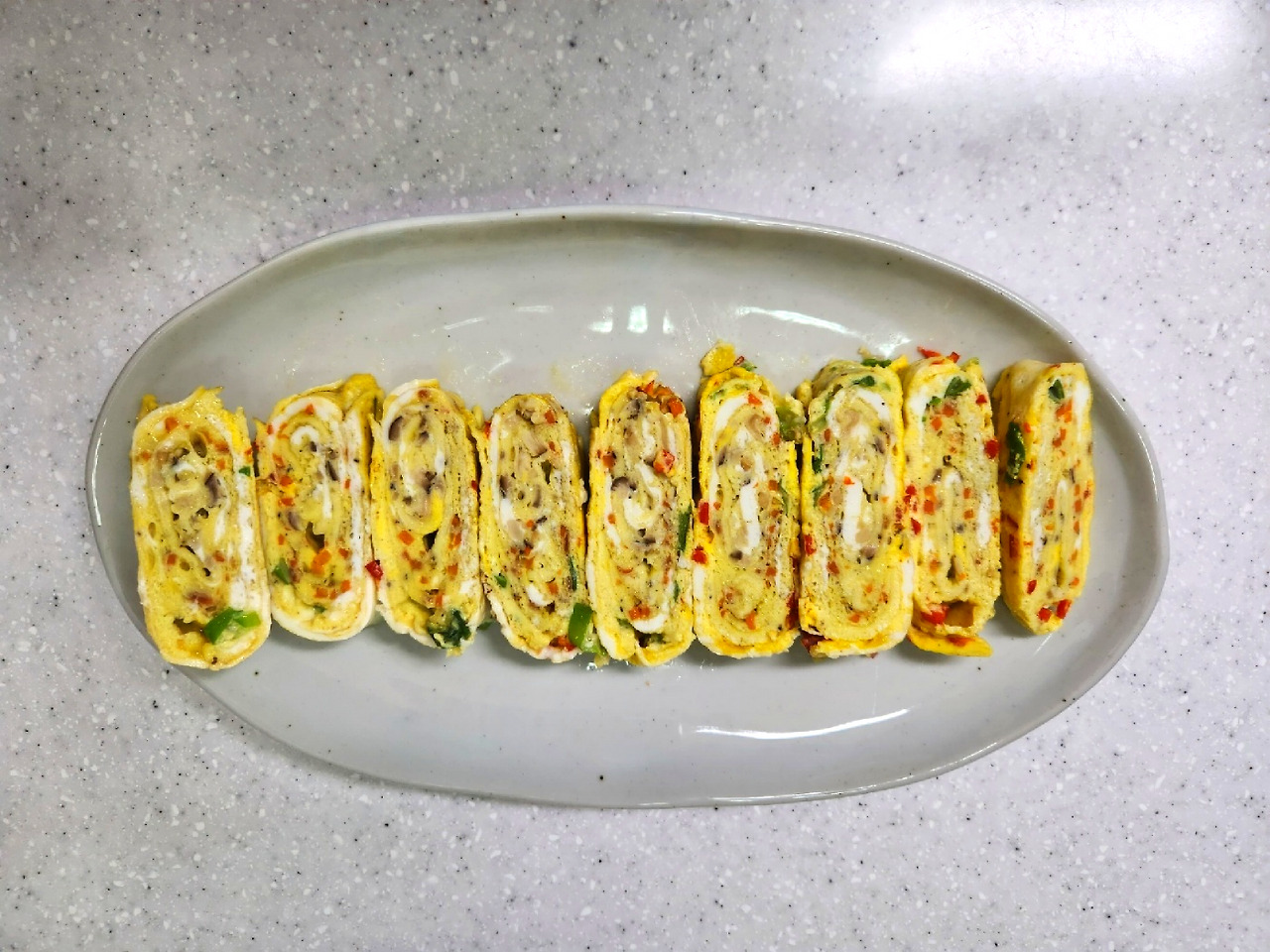 채소를 굵게 다지면 계란이 잘 안 말리기 때문에 가급적 곱게 다져야해요. 그리고 맛소금이나 조미료 대신 표고버섯 우린물, 적당량의 허브솔트로 맛을 내기로 했습니다. 결과는 어떻게 됐을까요? 위에 사진처럼 대성공! 남편에 대한 사랑 때문인지 달걀이 술술 잘 말리더라고요. 여보, 이건 그냥 계란말이가 아니야. 사랑말이야.