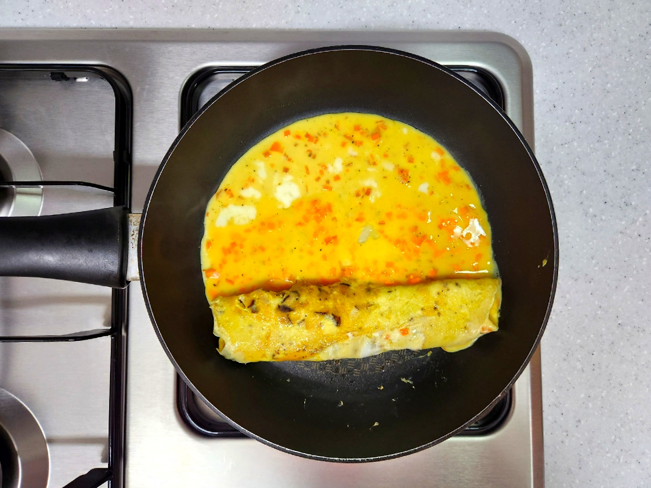 약불에서 프라이팬을 달군 뒤 식용유 1t를 두르고 계란물 하나를 익혀주세요. 잘 말면서 다음 계란물을 이어붙이는 식으로 계속 말아줍니다.