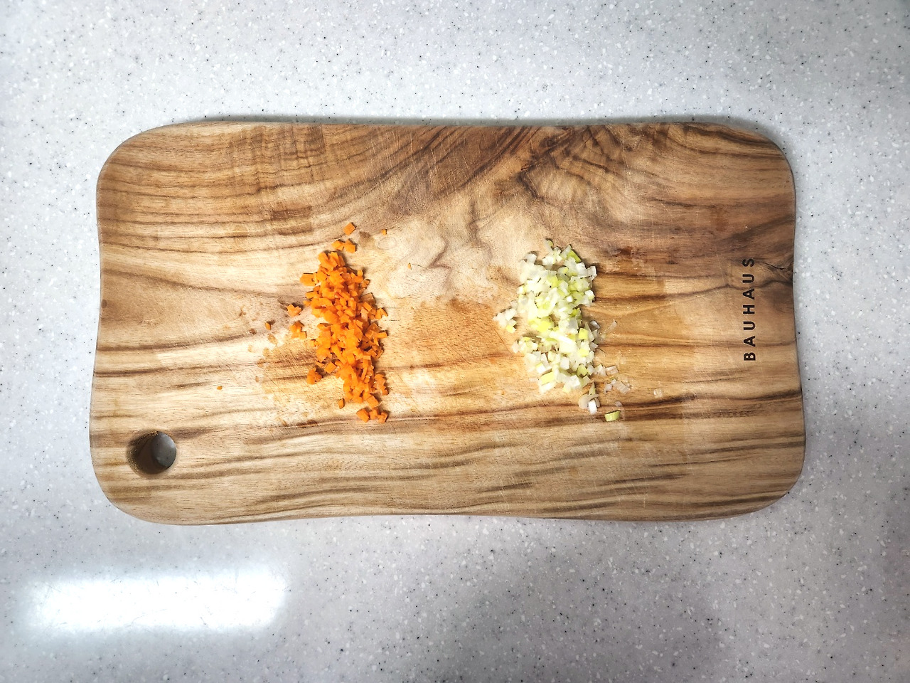 (볶음밥용보다 더 작게 다져주세요. 청고추 대신 대파나 쪽파, 양파 넣어도 상관없습니다.)