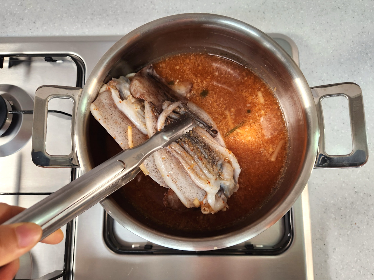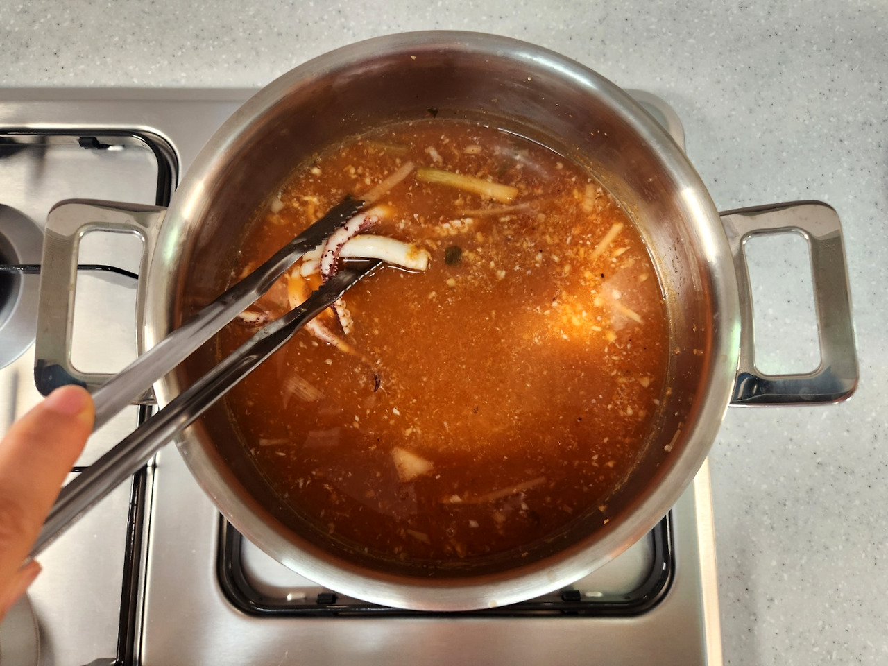 냉동 오징어를 넣고 5~10분 뒤 오징어가 익으면 가위, 집게로 잘라주세요.