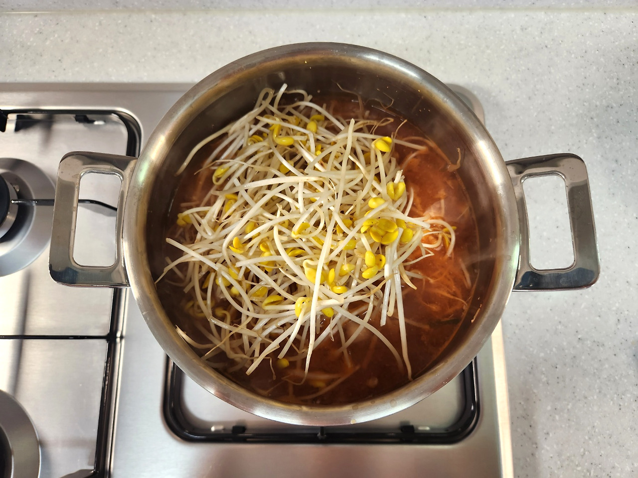 콩나물을 넣고 숨이 죽으면 마지막으로 불을 끄고 간을 해줍니다.