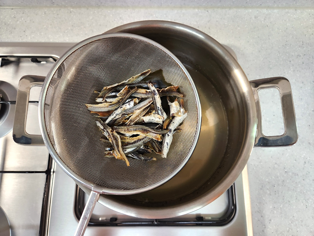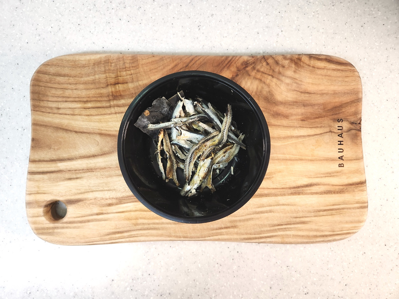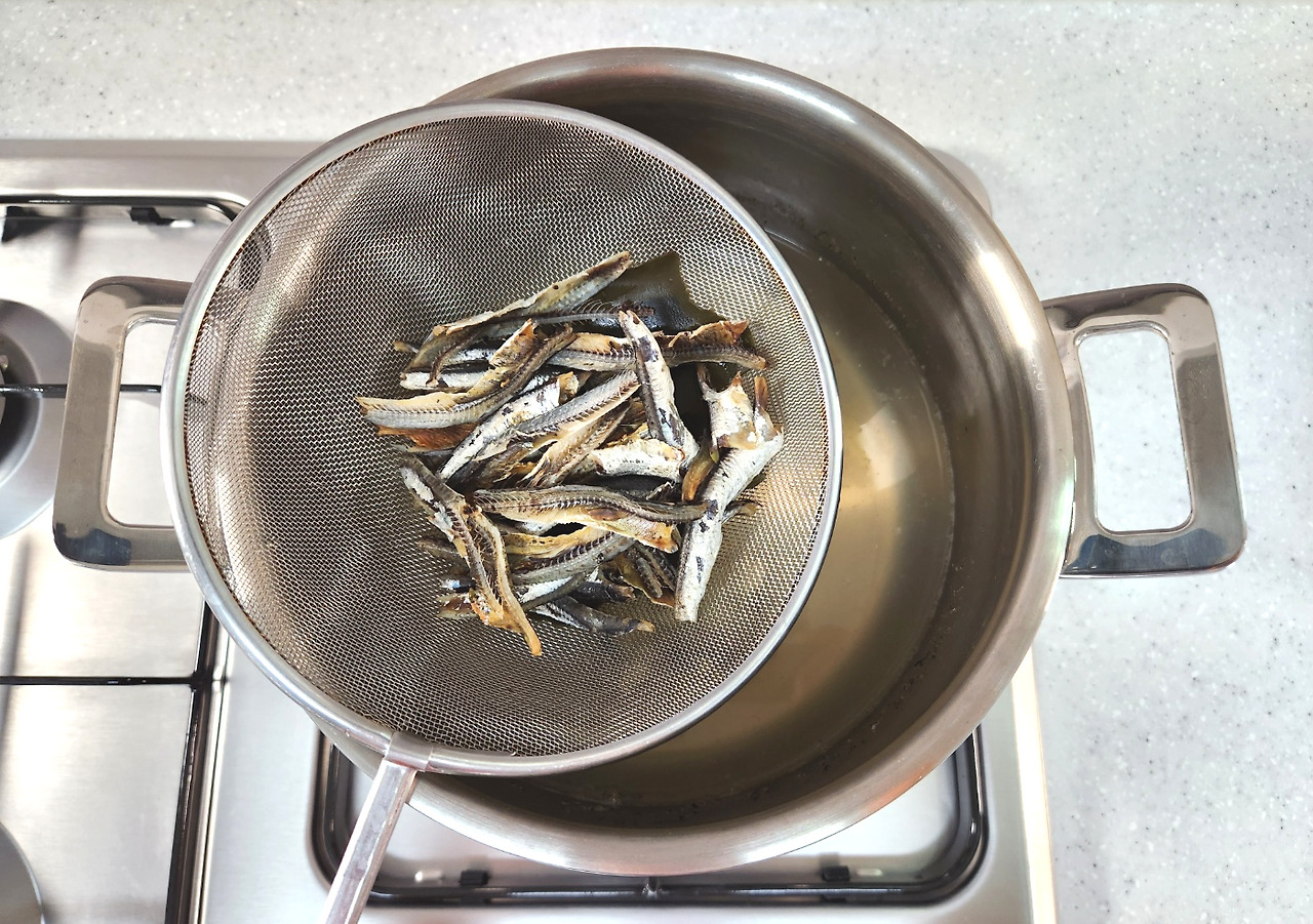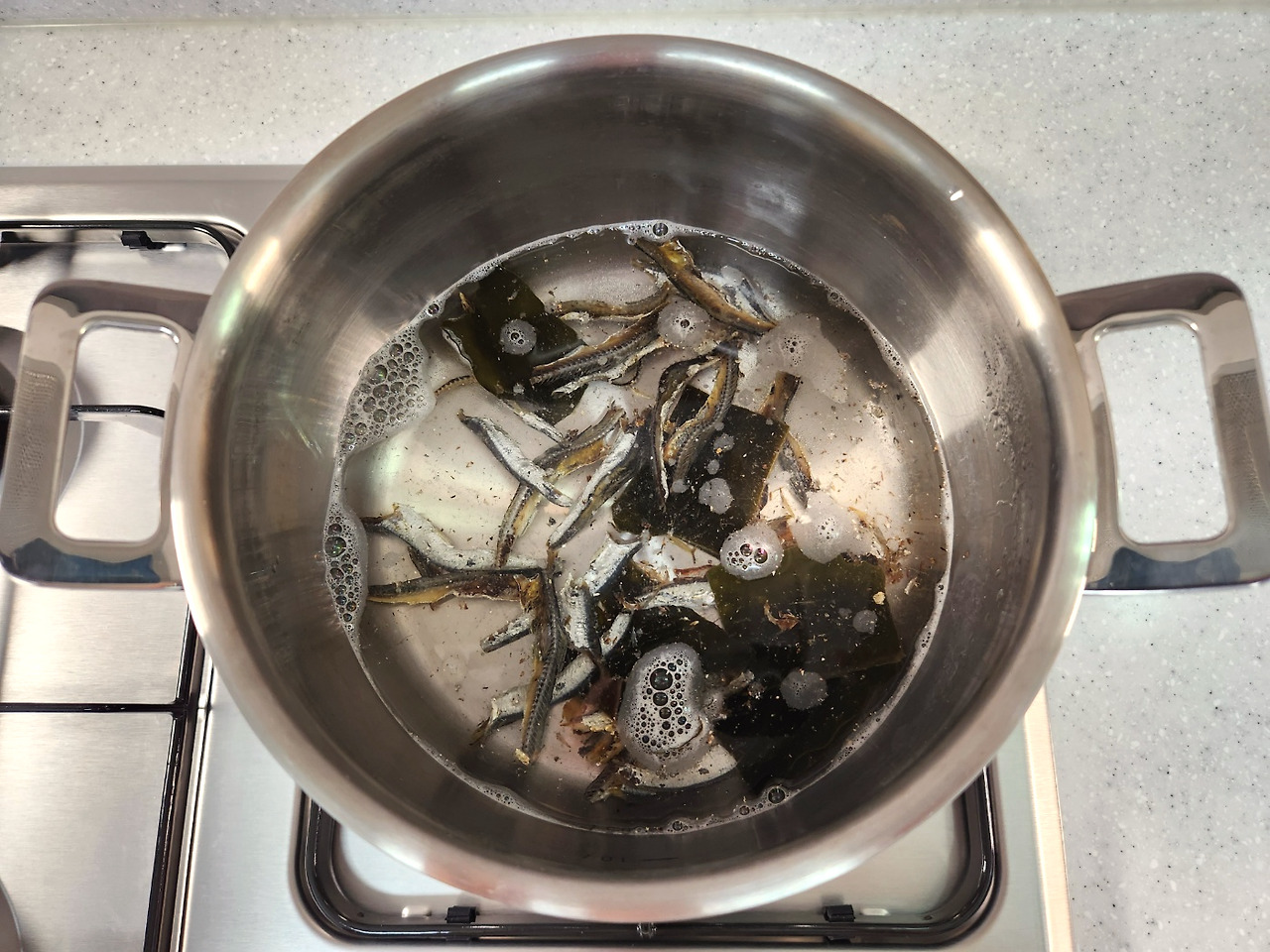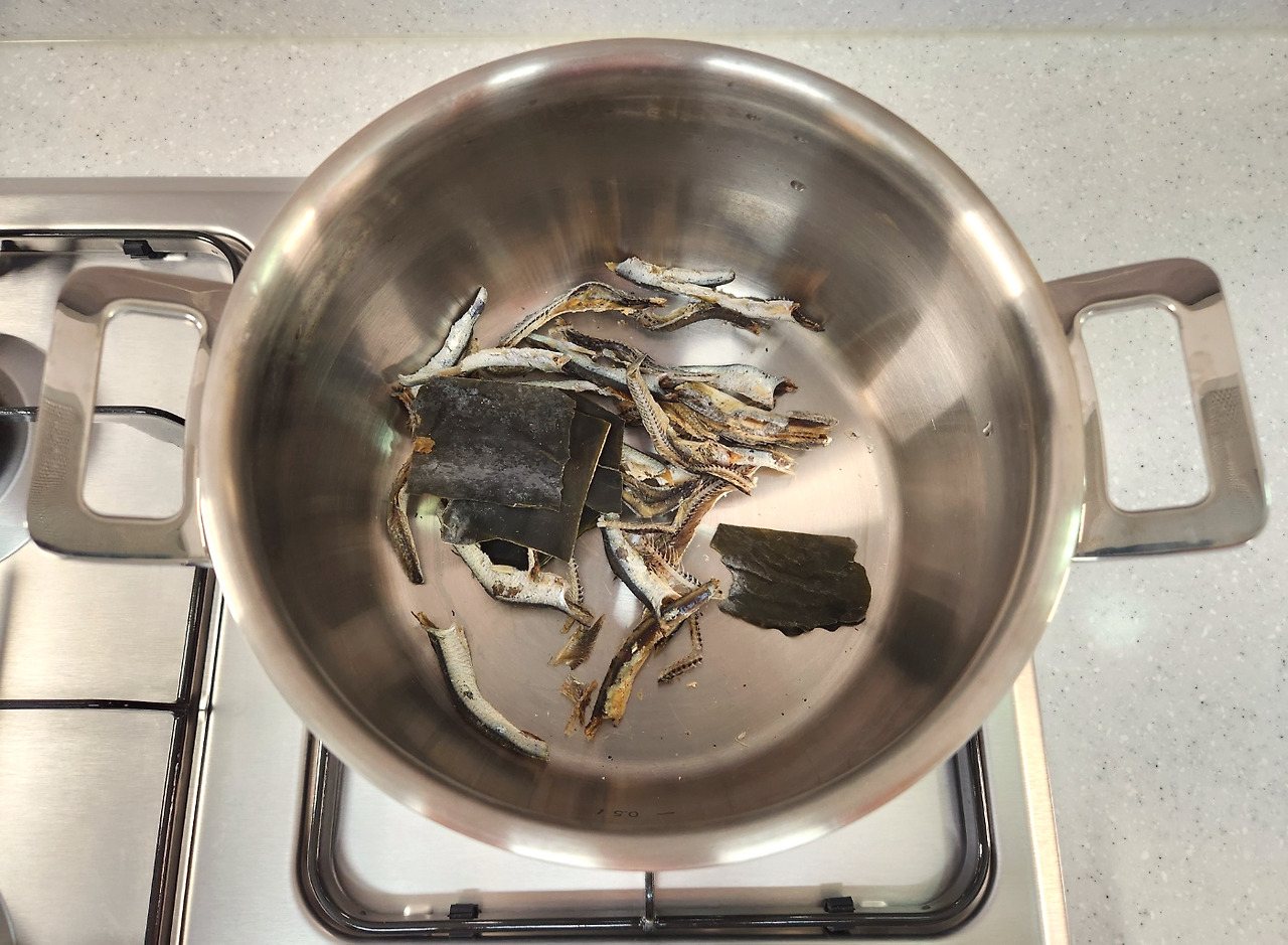 다시마, 멸치는 기름 없이 볶으며 비린내를 날려주세요. 고소한 향이 올라오면 물을 넣고 5분 간 푹 끓여주세요.