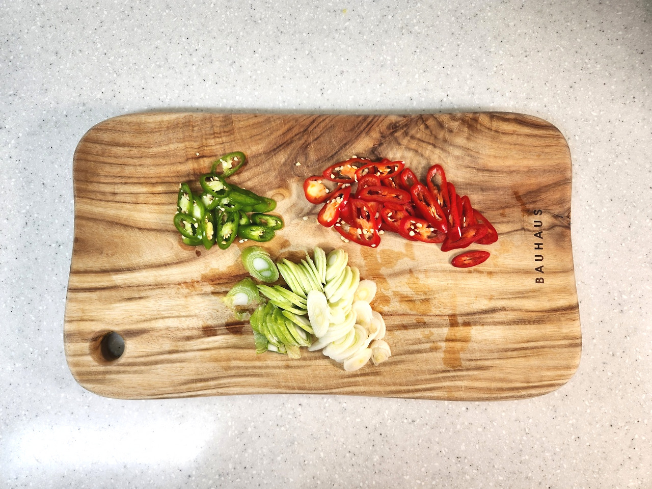 대파 40g, 청홍고추 1개씩, 다진마늘 1T