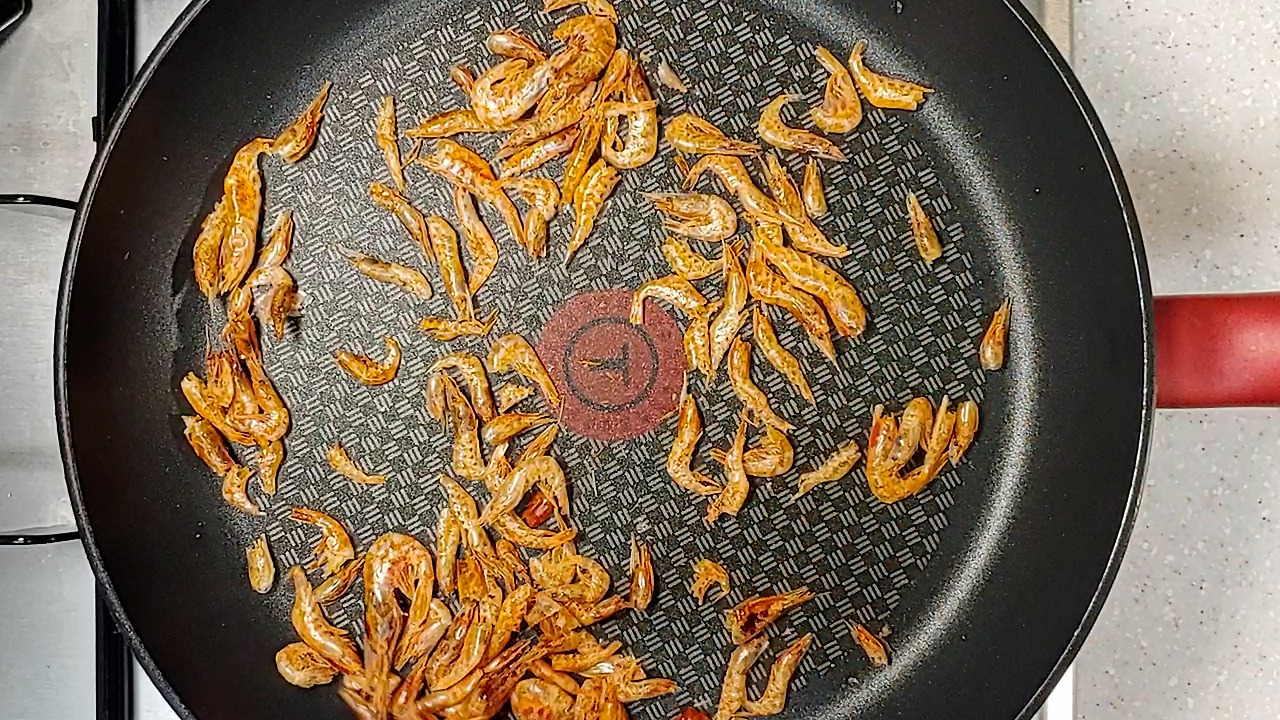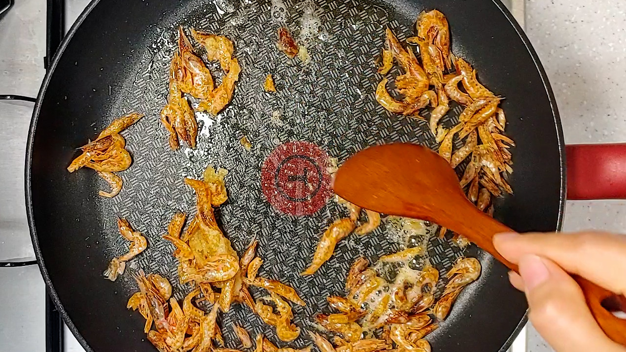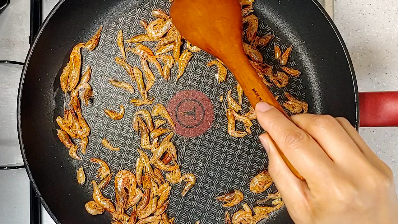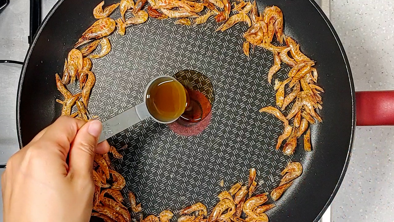홍새우는 약불에서 기름 없이 한번 볶아 비린내를 날려주세요. 이렇게 하면 더 고소하고 바삭한 건새우를 먹을 수 있어요.
