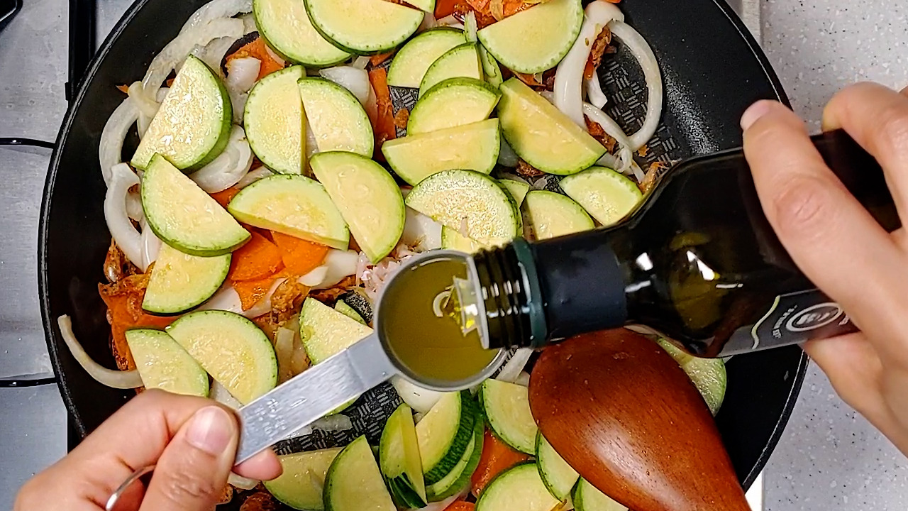 양파가 약간 투명해지면 애호박, 새우젓 1t, 올리브유 1T를 넣고 잘 볶아줍니다.