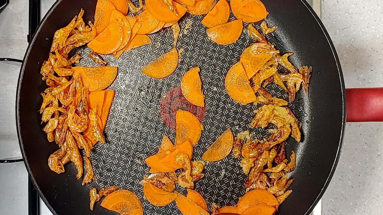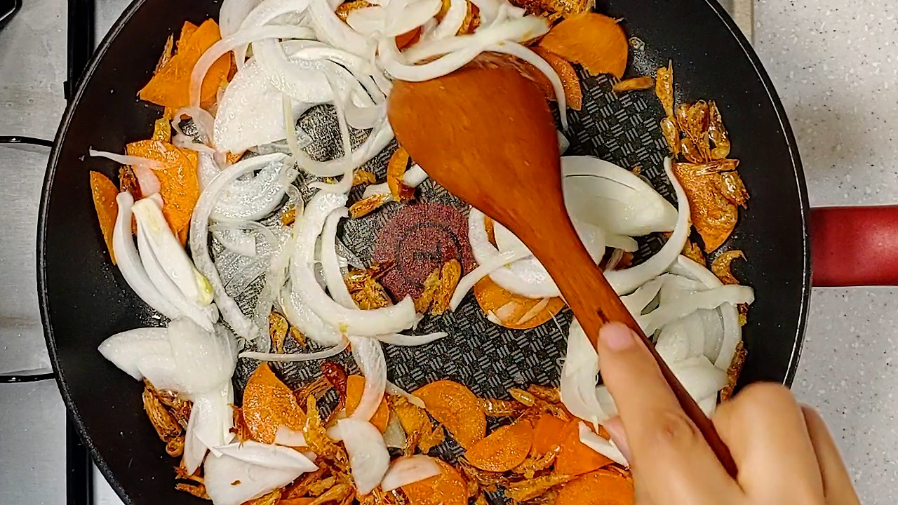 고소한 냄새가 나면 당근을 넣고 볶다가 어느정도 부드러워지면 양파를 넣고 볶아주세요.