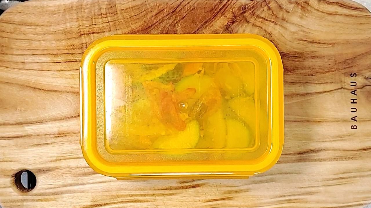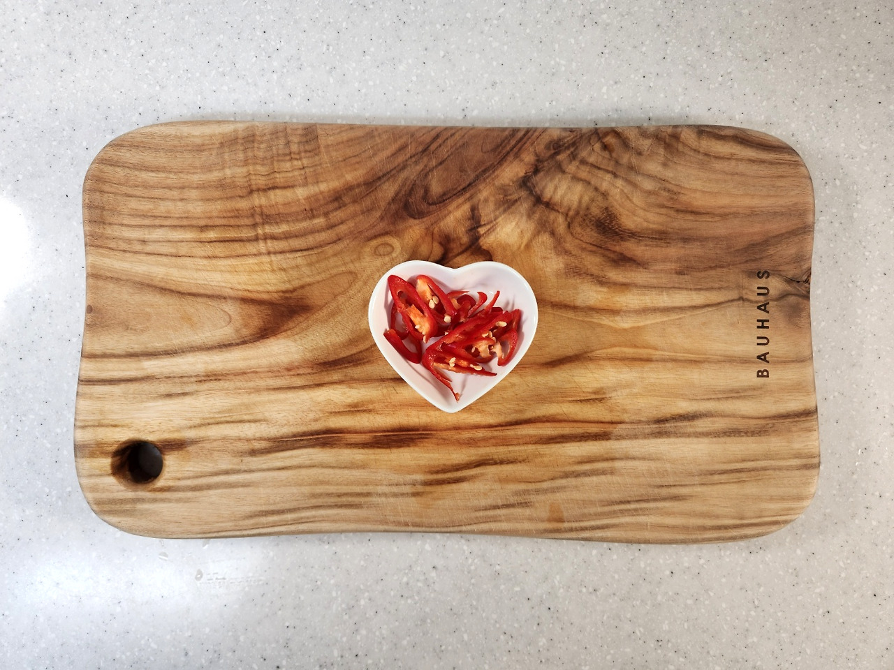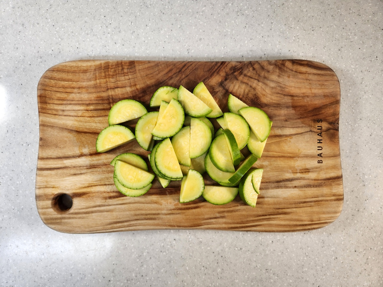 애호박은 0.7cm 두께로 조금 도톰하게 준비해주세요. 이래야 금방 물러지지 않고 식감도 좋아져요. 홍고추 반 개는 어슷썰어 준비합니다.