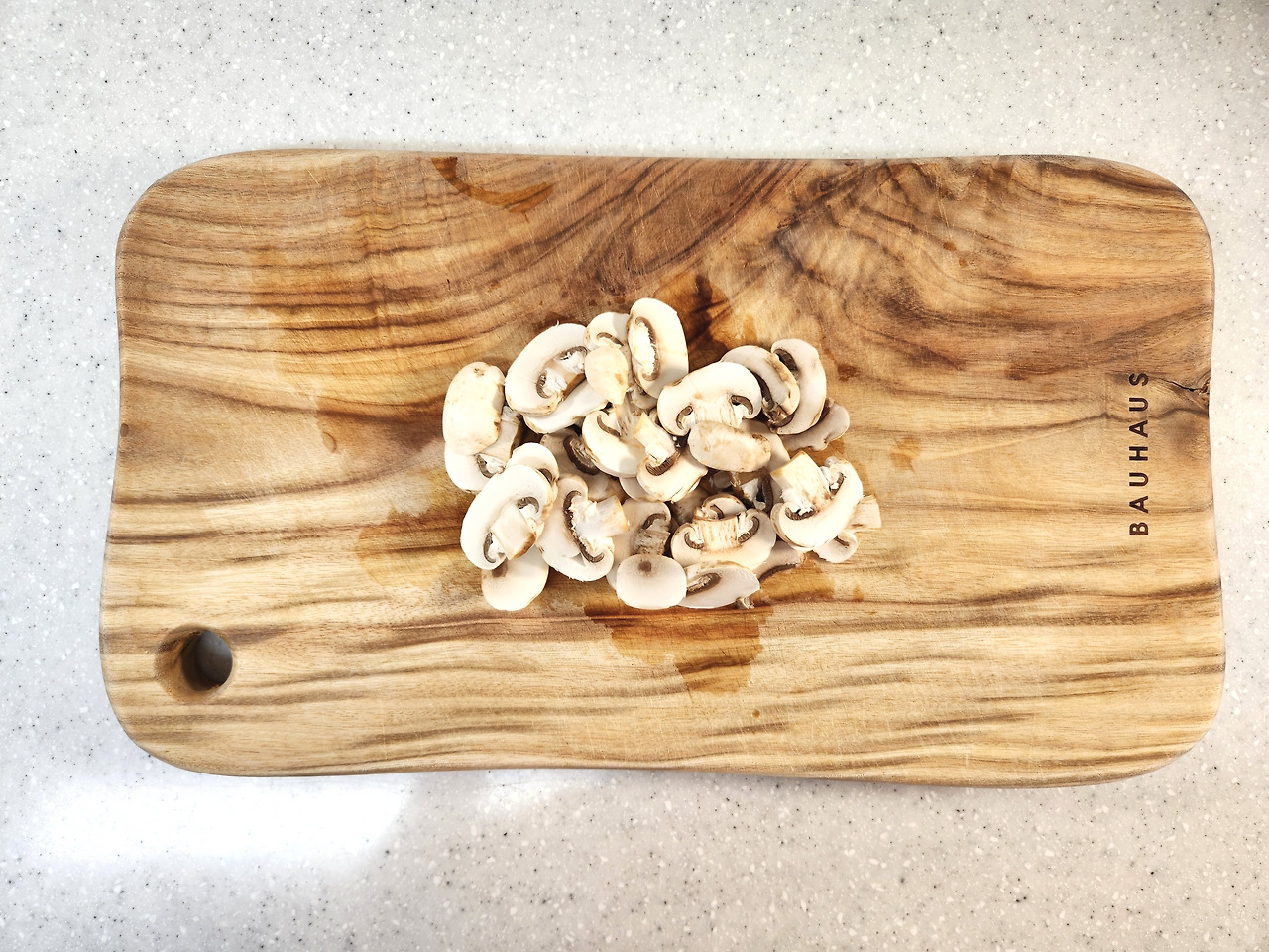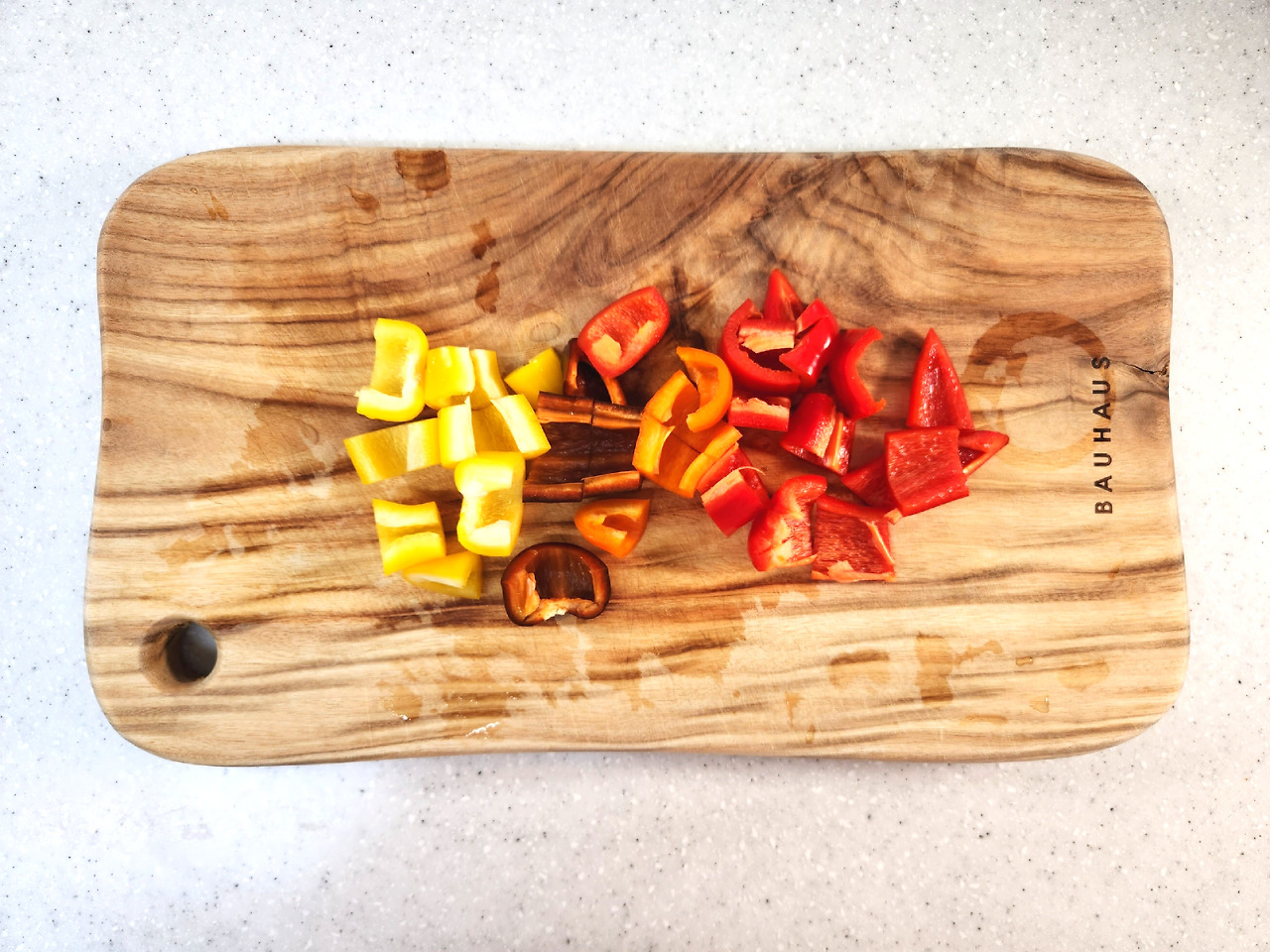 양송이는 적당한 두께로, 파프리카는 한입 크기로 썰어줍니다.