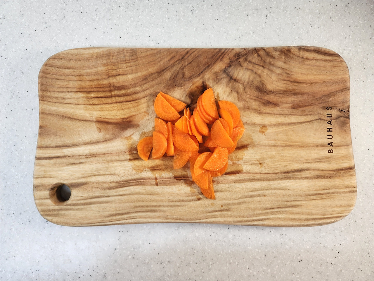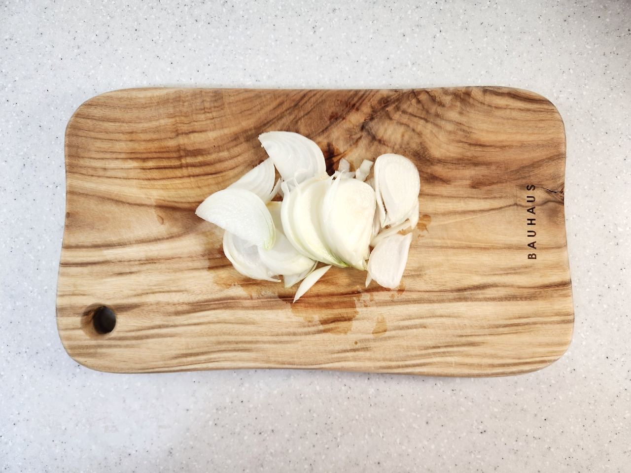 설탕을 따로 넣지는 않을 거라 당근은 얇게 반달썰기합니다. 양파는 아삭한 맛을 살리기 위해 0.7cm로 도톰하게 썰어주세요.