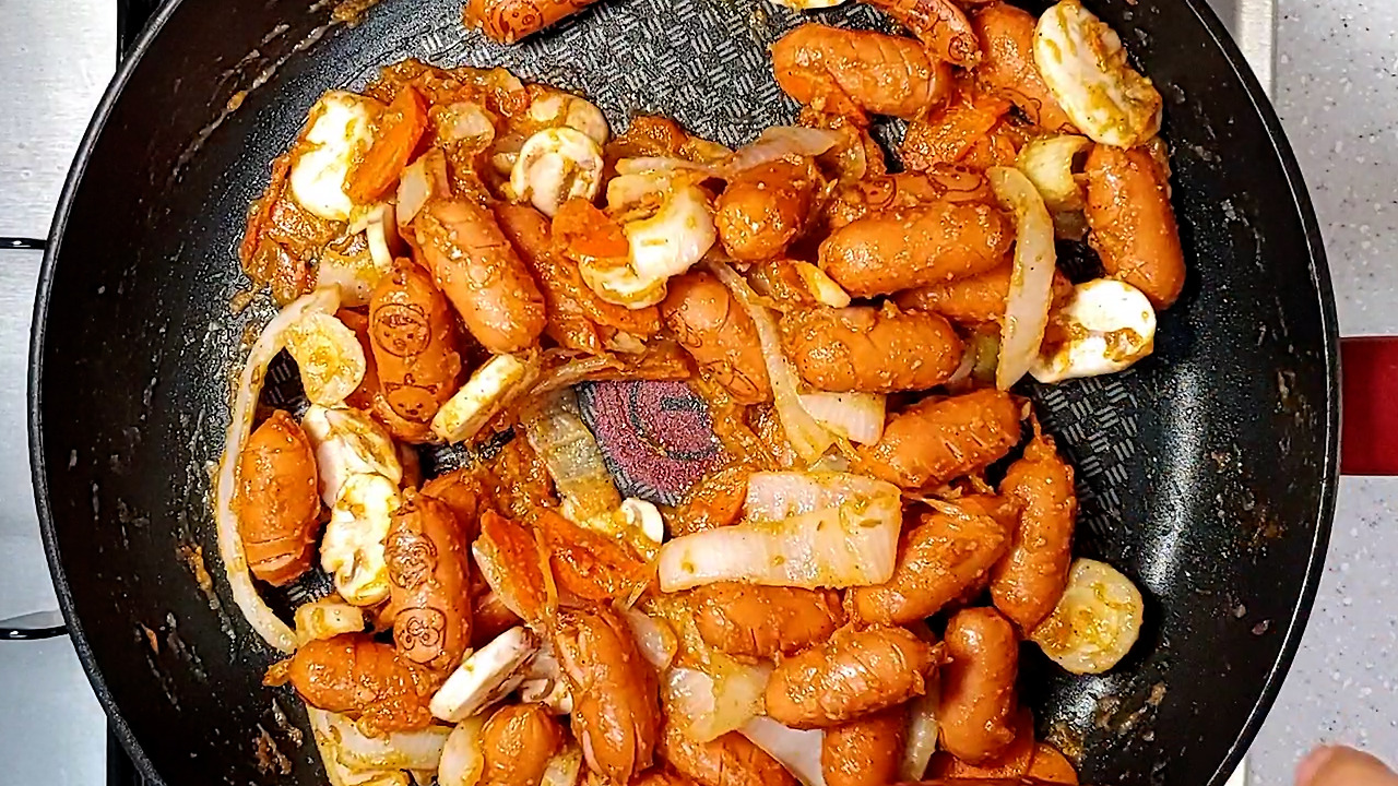 소세지를 넣고 생강가루, 후추를 넣어 줍니다. 한번 휘릭 볶은 다음 양송이를 넣고 볶아주세요.