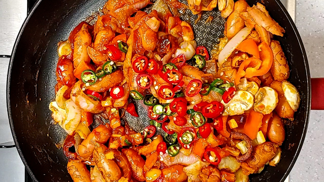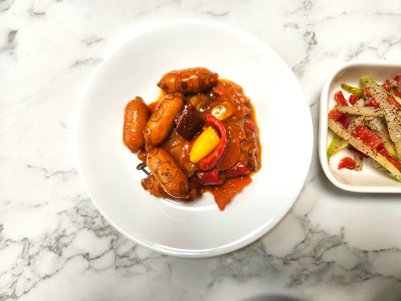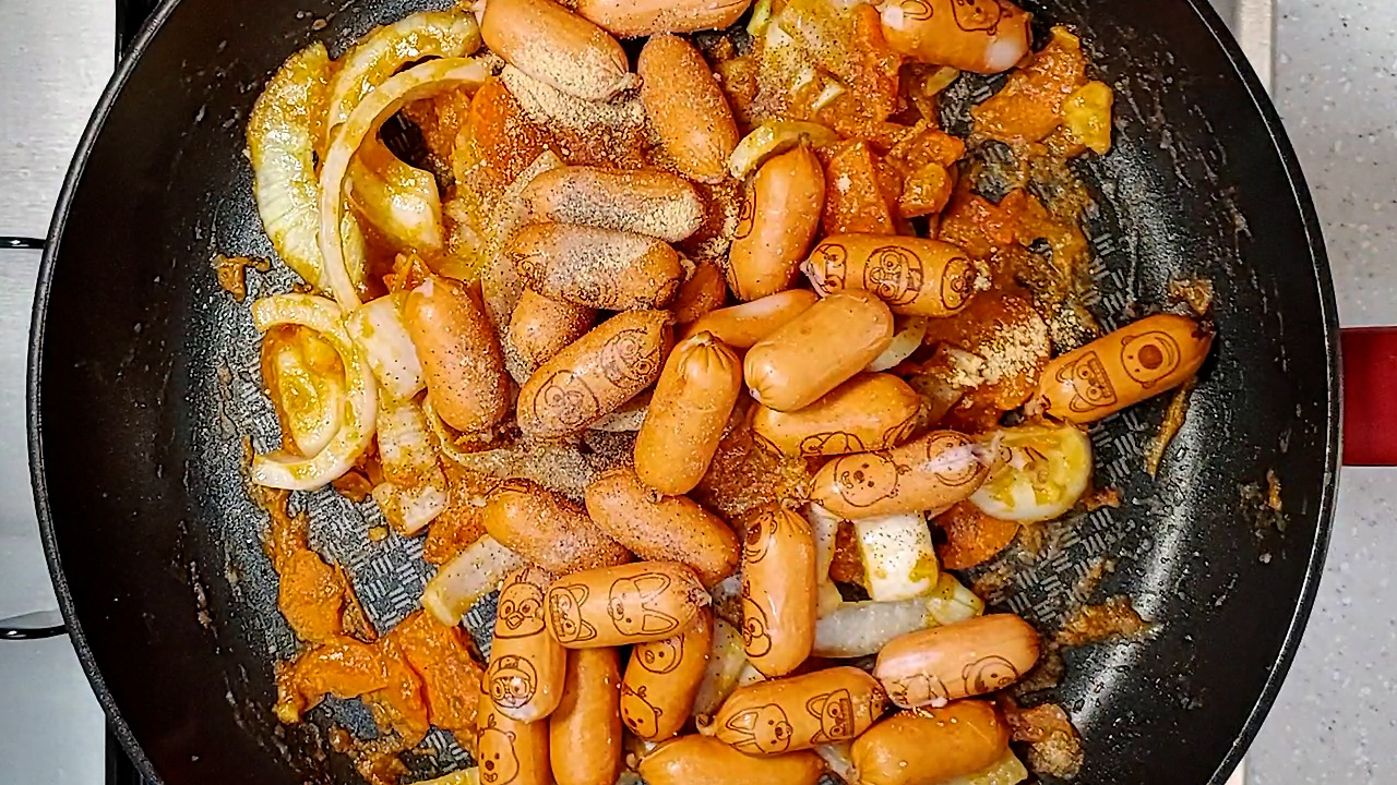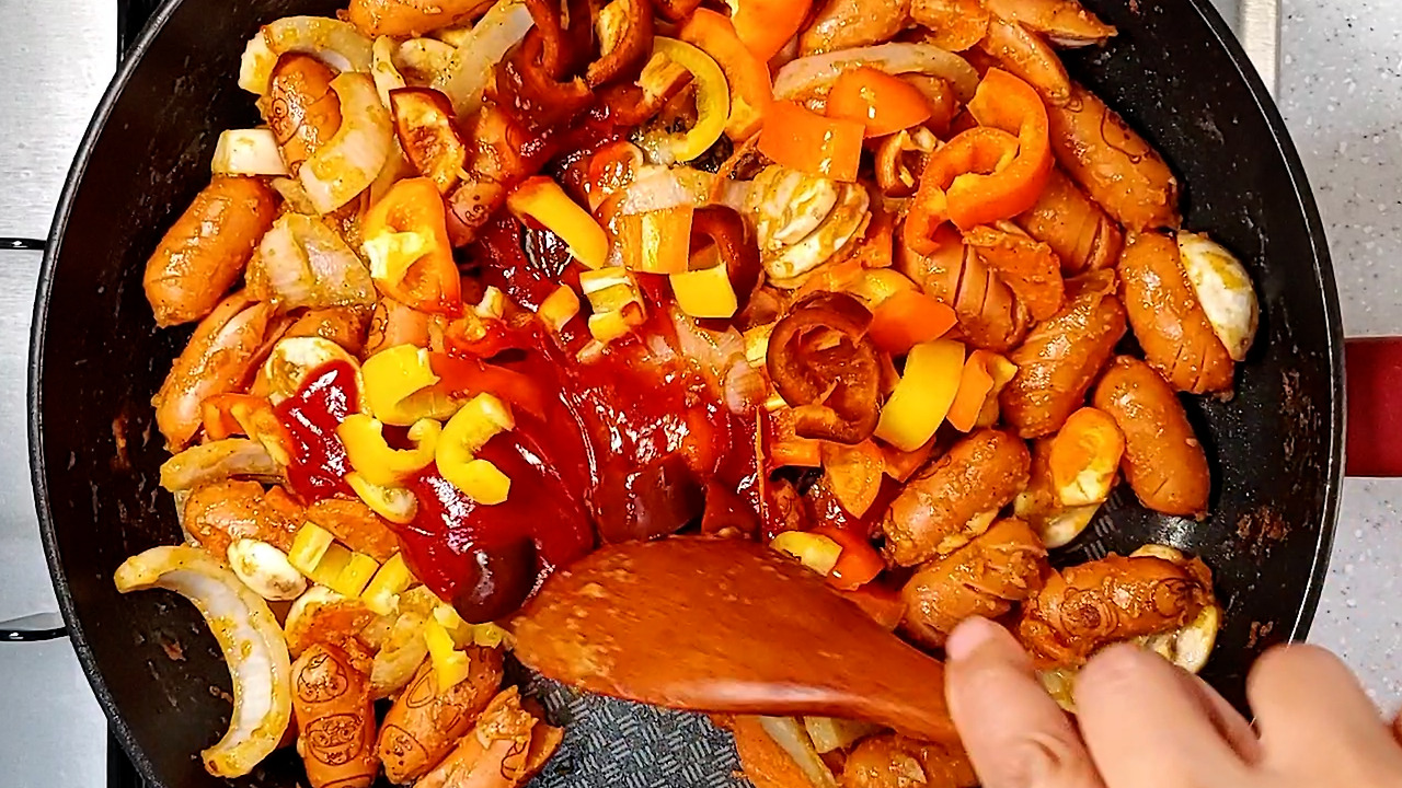 소세지의 칼집이 벌어지기 시작하면 케찹, 미니파프리카를 넣고 볶습니다. 마지막으로 불을 끄고 홍고추, 청양고추(선택)를 넣은 뒤 마무리합니다.