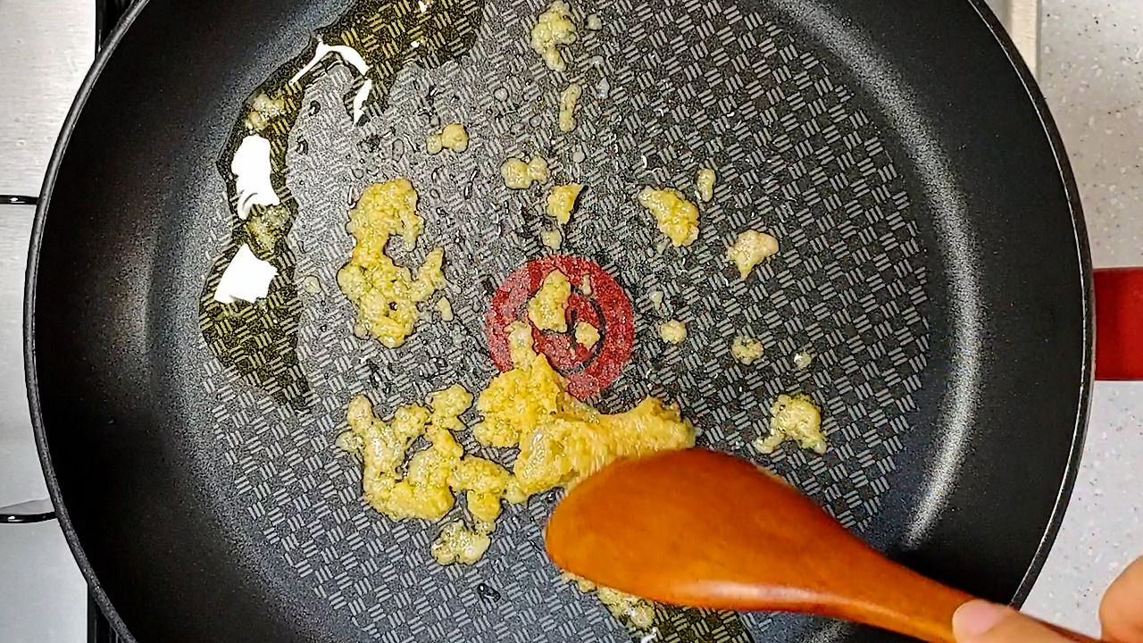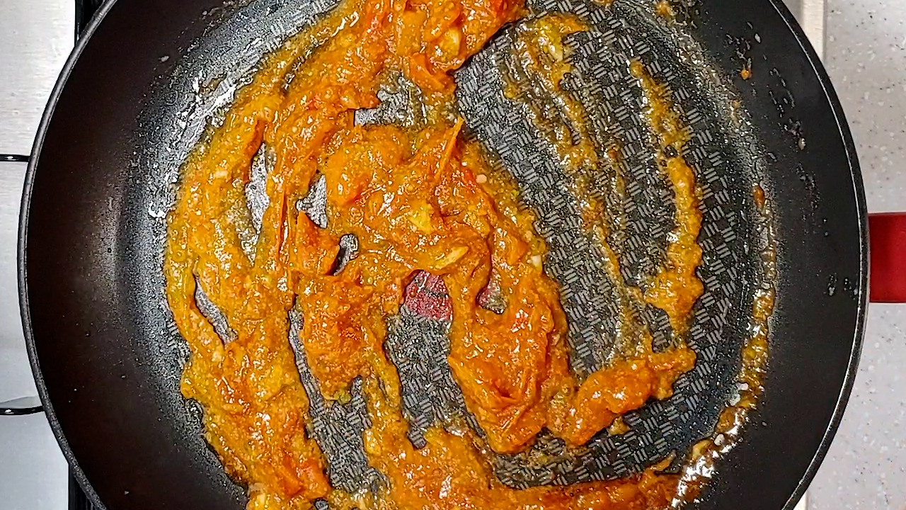 올리브유에 마늘을 달달 볶아주세요. 고소한 향이 올라오면 토마토를 넣고 살살 으깨줍니다.