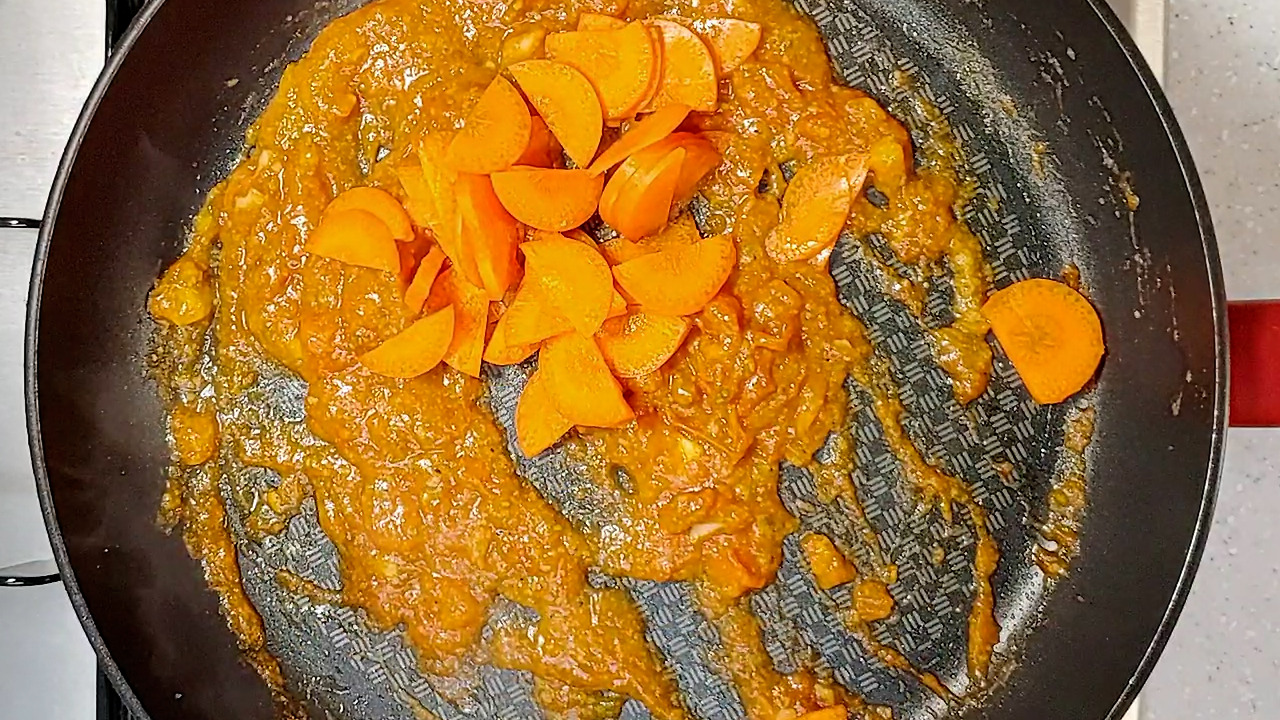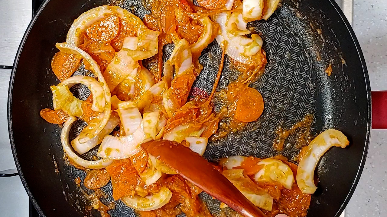 당근이 부드럽게 익으면 양파를 넣고 한번 볶아주세요.