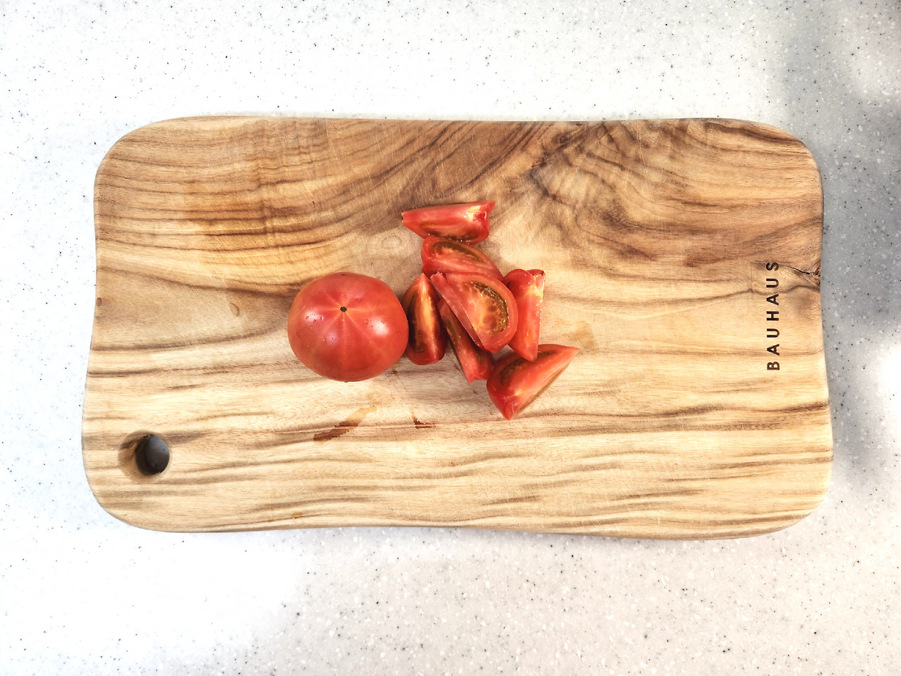 간이 잘 배게 소세지는 칼집을 잘게 넣어주세요. 토마토는 소스처럼 활용할 거라 8등분 이상으로 조각냅니다.