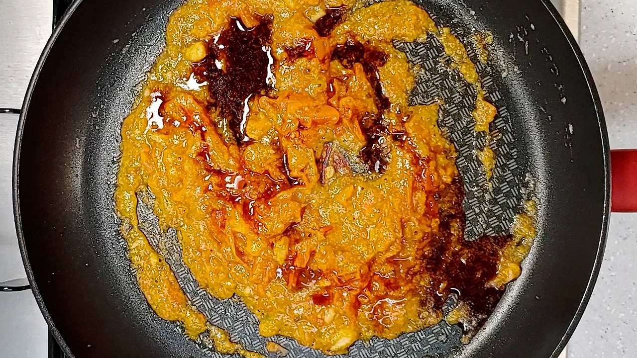 토마토가 소스처럼 익으면 저염간장을 넣고 같이 볶아주세요.