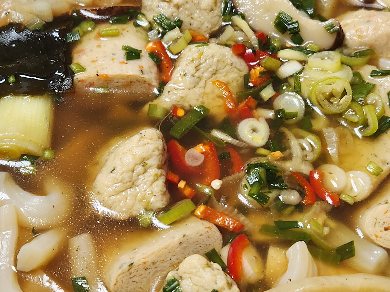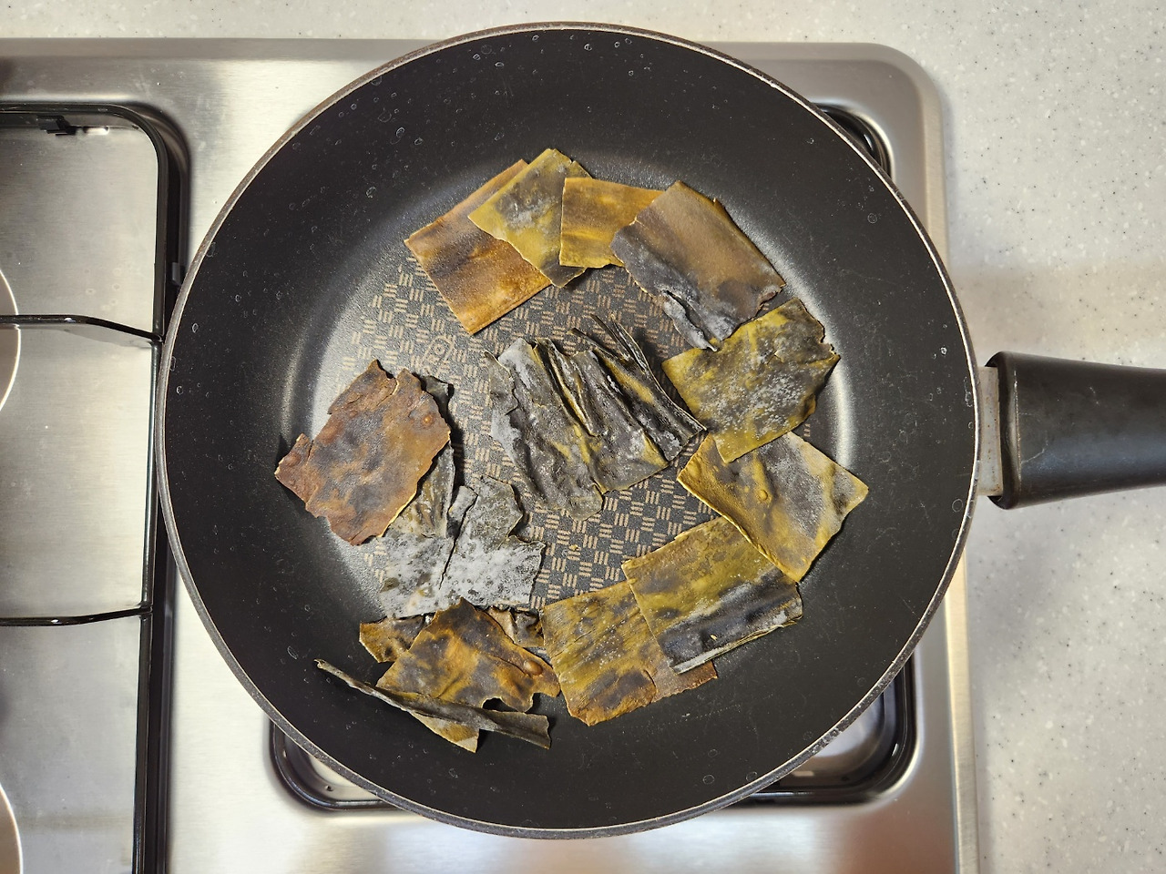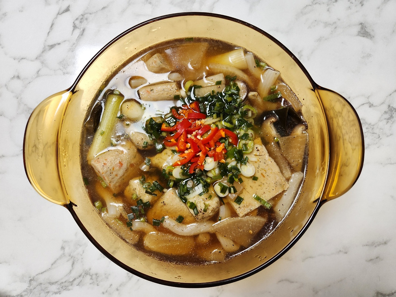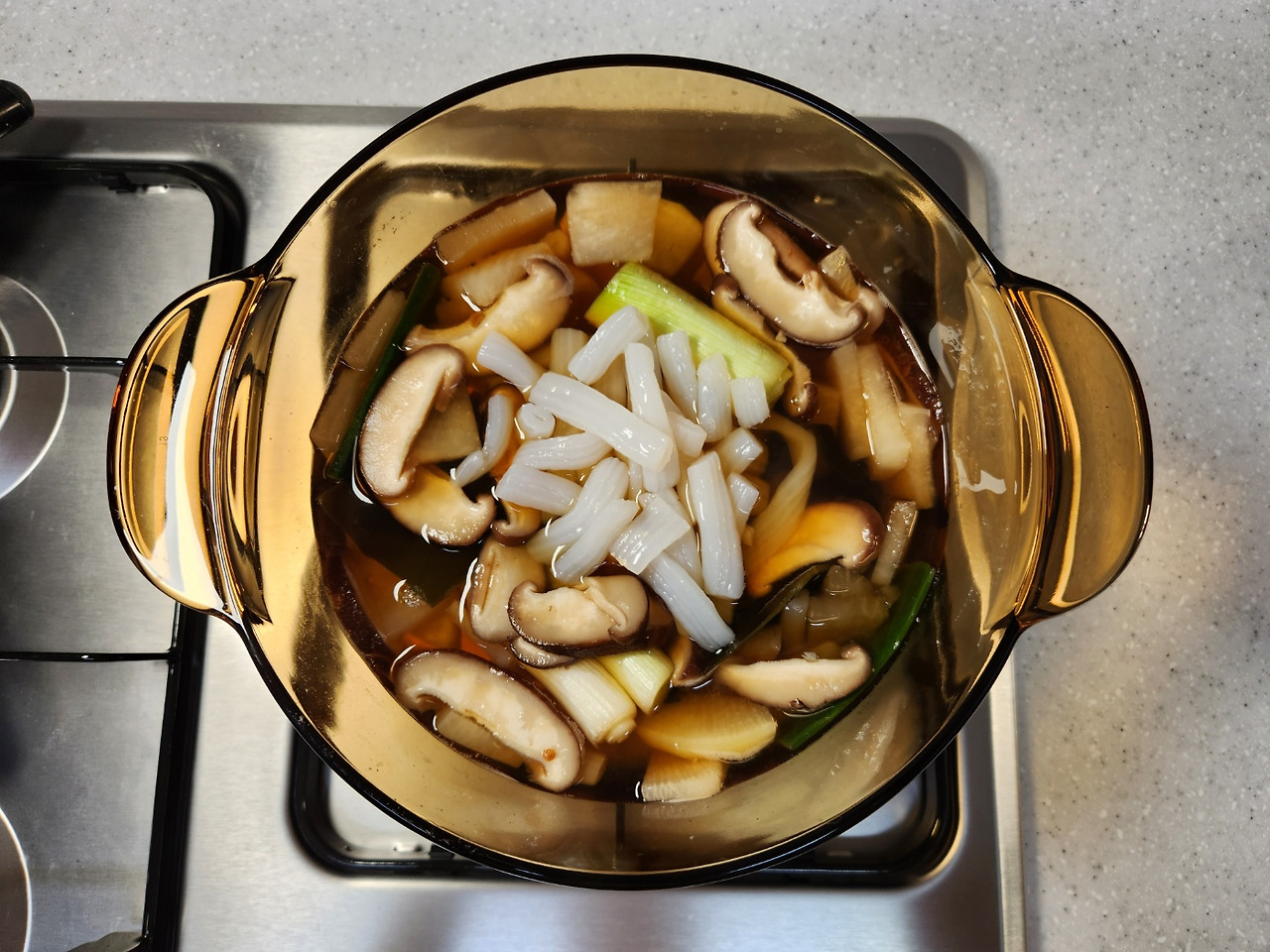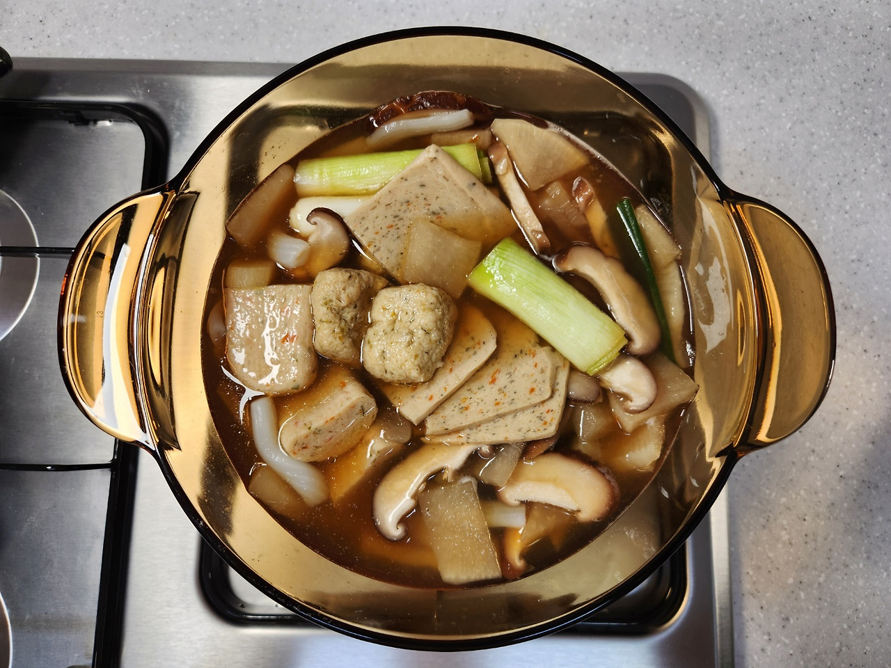 인터넷으로 비건 어묵을 주문한 다음 육수는 내가 직접 만들기로 했다. 멸치나 동물성 재료 없이 다시마와 베트남고추를 프라이팬에 한번 구워낸 뒤 무, 표고버섯, 대파를 넣고 채수를 푹 우려냈다. 국물이 잘 우러나면 다시마와 고추를 건져내고 비건 어묵을 넣으면 끝.