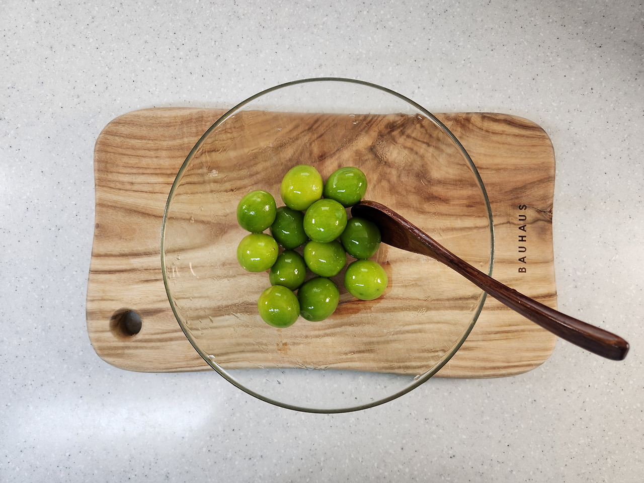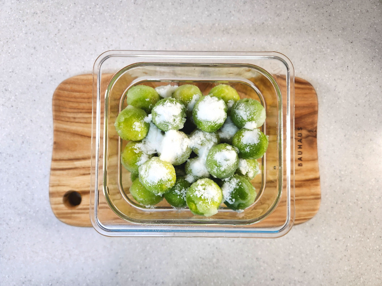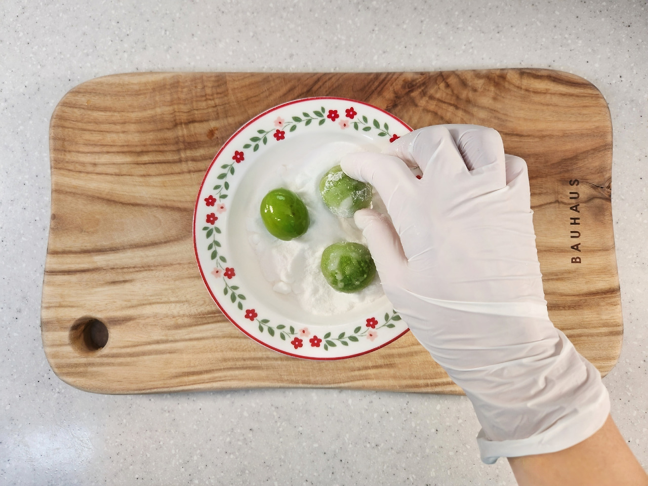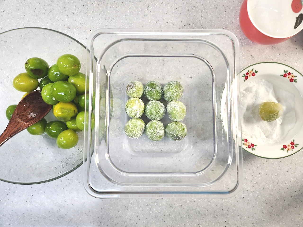올리고당이나 액상 알룰로스를 매실 겉면에 잘 묻혀주세요. 그런 다음 알룰로스 분말에 굴리면서 매실이 공기 중에 노출되지 않도록 꼼꼼히 발라줍니다.