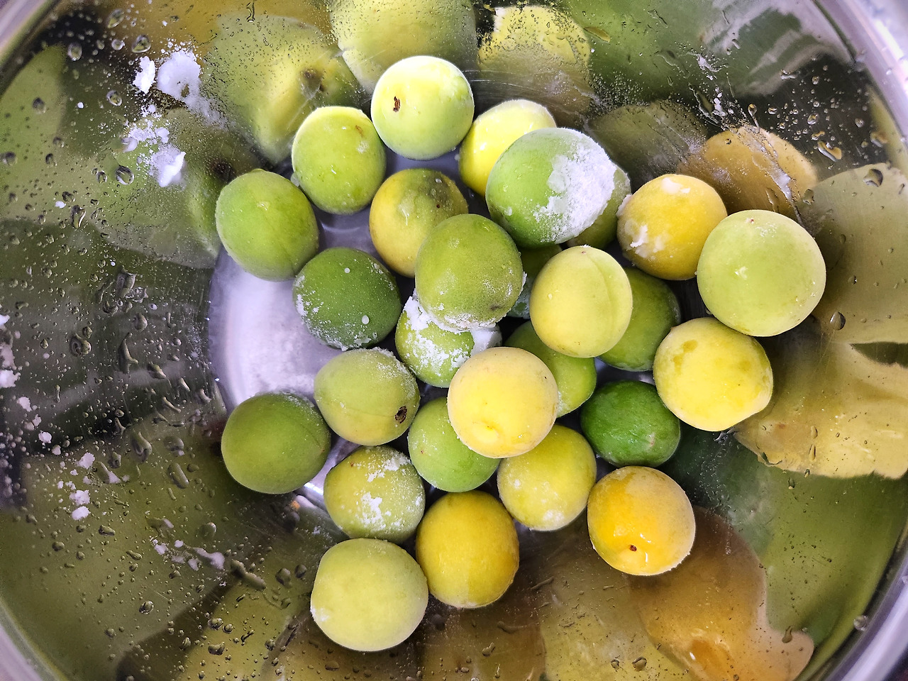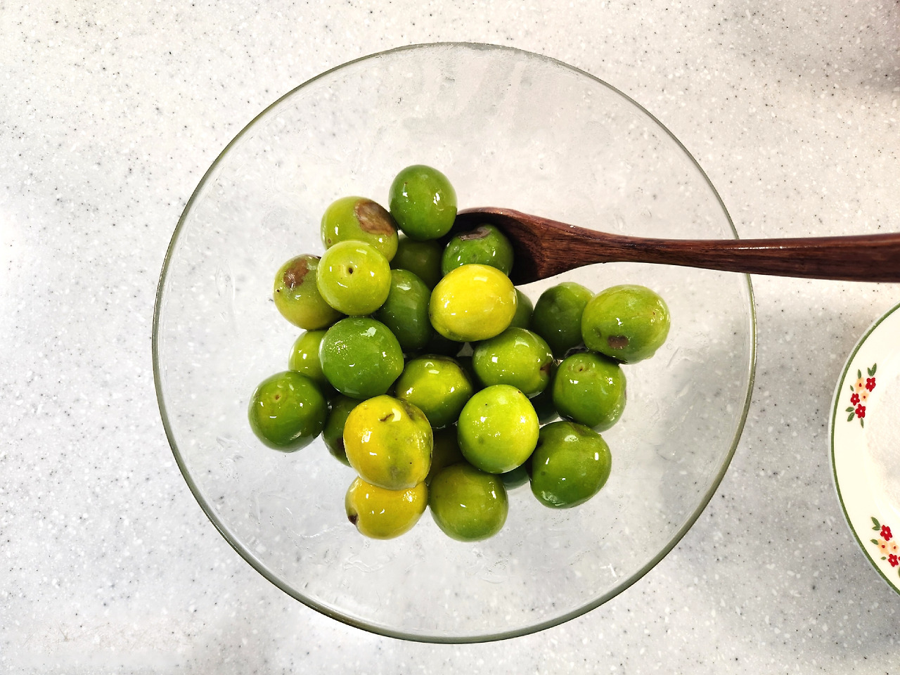 매실은 베이킹소다로 겉면을 깨끗이 씻은 뒤 이쑤시개로 꼭지를 따 잘 말려서 준비합니다.