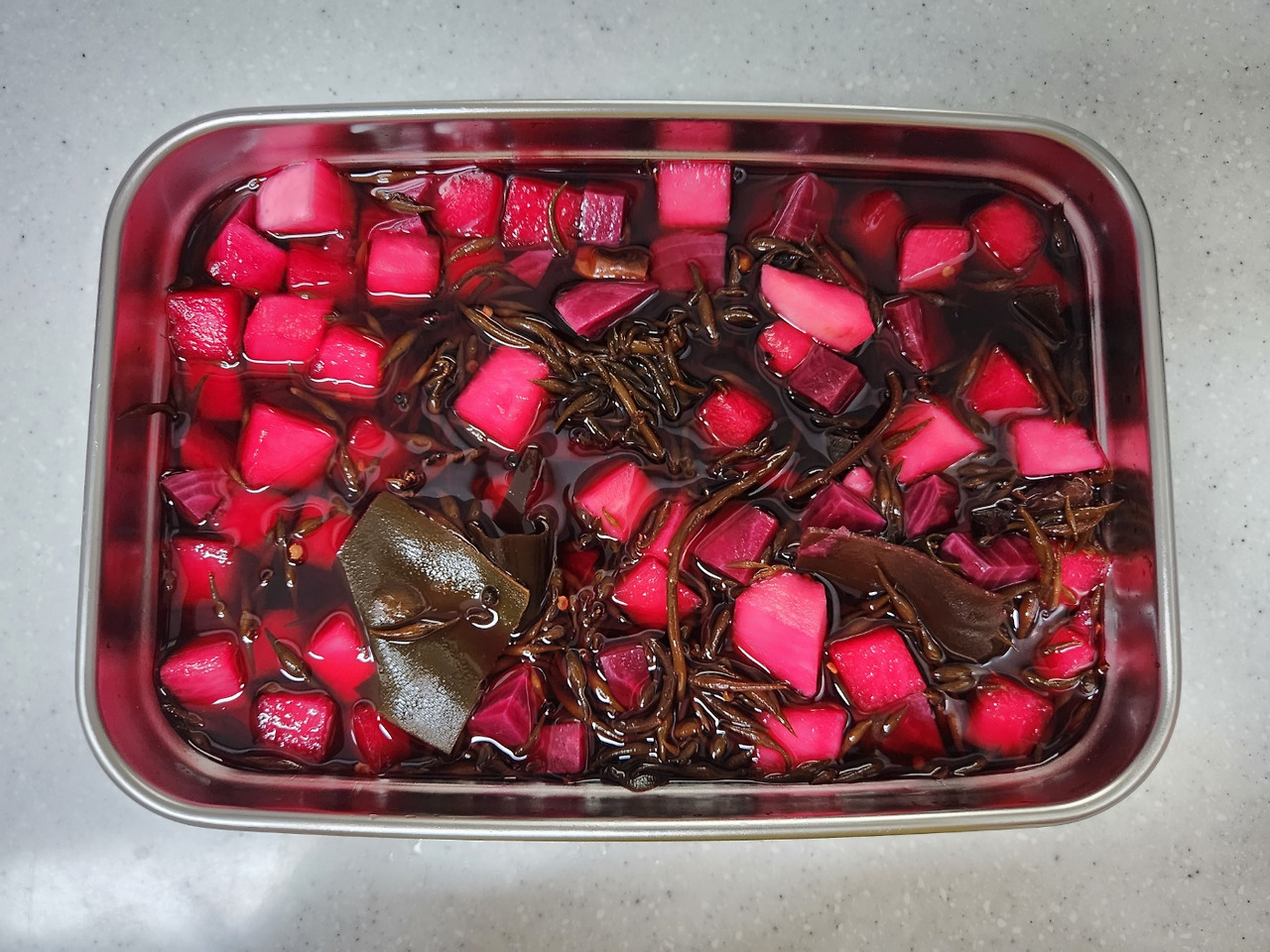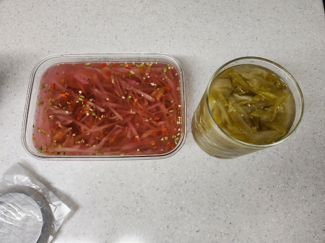 적색양파 300g을 얇게 썰어 소금 4.5g, 식초 2큰술을 넣고 조물락조물락 무치면 맛있는 양파초절임 끝. 반나절만 보관하면 자연스럽게 달큰한 맛이 올라와 밥반찬으로도 좋고 어머님 좋아하시는 쌀국수에 좋은 곁들임이 된다. 비트와 무를 섞어서 채식으로 물김치를 만들었는데 색이 와인 같기도 하고 너무 예쁘다며 맛이 좋다고 하셨다. 이것도 조만간 더 만들어드릴 예정이다. 다행인건 어머님은 채식을 좋아하셔서 채식으로 나와 많은 공감대를 나누고 계시다는거다.