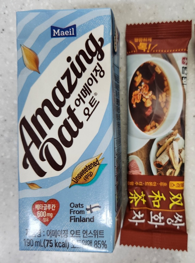 쌍화차의 찐한 맛이 오트에서 올라오는 약간의 잡곡맛(?)을 눌러 준다. 달달함이 믹스커피 못지 않고 이렇게 먹으면 오히려 건강해지는 기분이 든다. 쌍화차에 들어있는 견과류 맛과 오트밀크의 맛이 정말 잘 어울린다. 커피믹스는 한포에 50kcal, 쌍화차는 60kcal지만 동맥경화 위험이 있는 식물성경화유지 대신 몸에 좋은 견과류로 고소함을 채울 수 있다. 비건으로 만들어진 달달한 아이스쌍화라떼! 이걸로 악마의 맛을 이겨내고 있다.