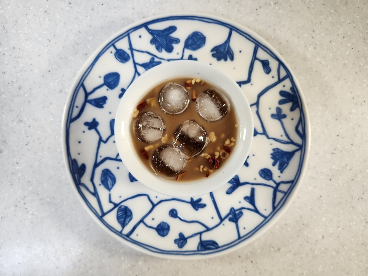 요즘엔 약과, 팥빙수 등 할매푸드의 인기가 뜨겁다는데 겨울에 사놓고 먹지 않은 쌍화차가 잔뜩 쌓여 있어 시원하게라도 먹어 볼까? 하다가 만들게 됐다. 쌍화차 1봉과 뜨거운물 2큰술을 넣어 잘 녹인다음 오트밀크 100ml를 넣고 잘 저어준다. 마지막으로 시원하게 얼음 동동 띄우면 비건 아이스쌍화라떼 끝!
