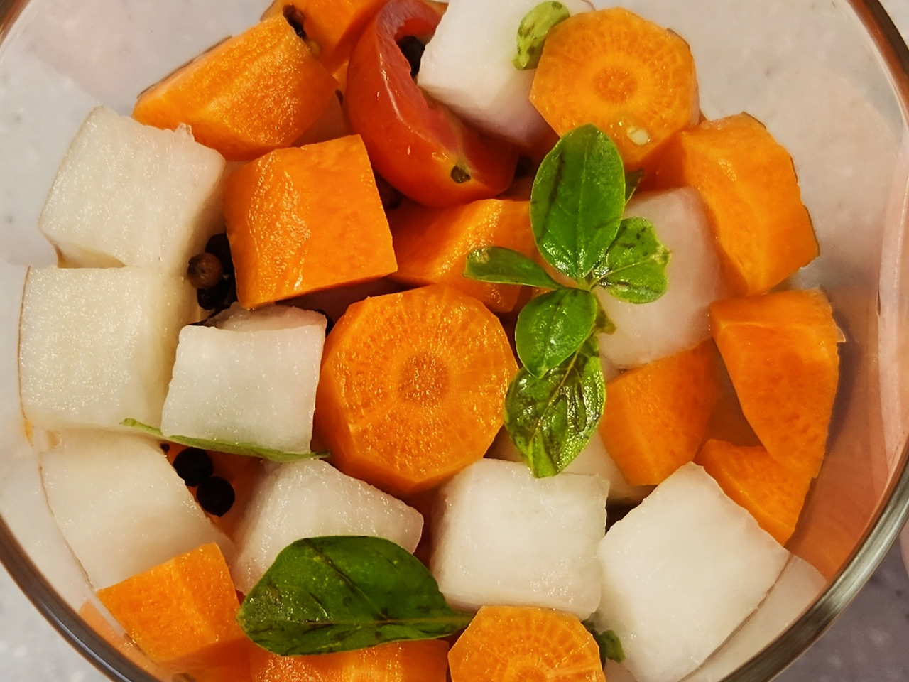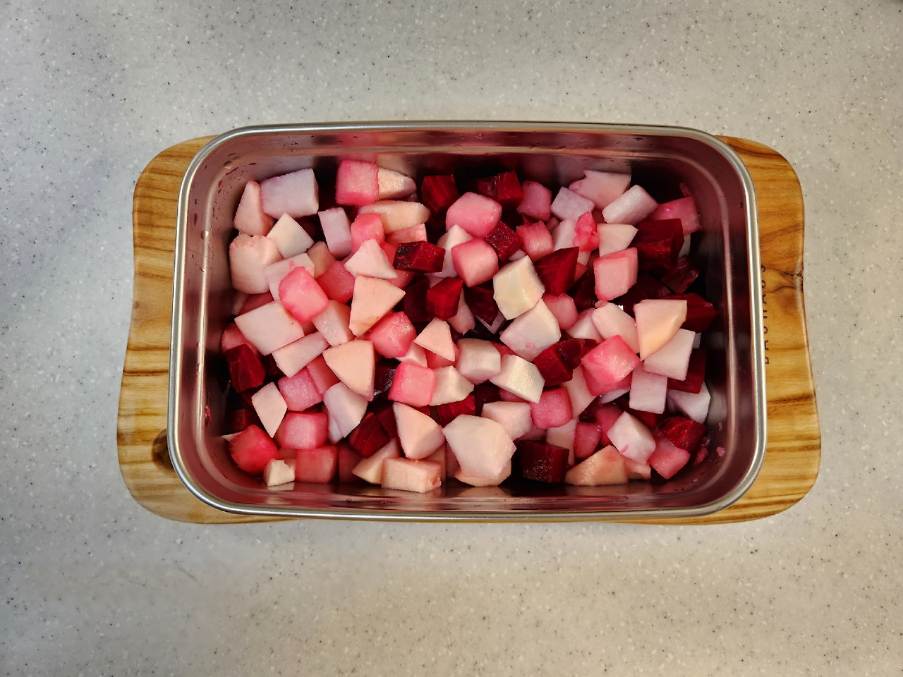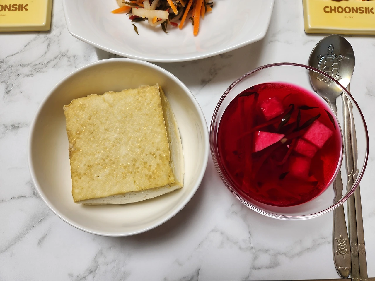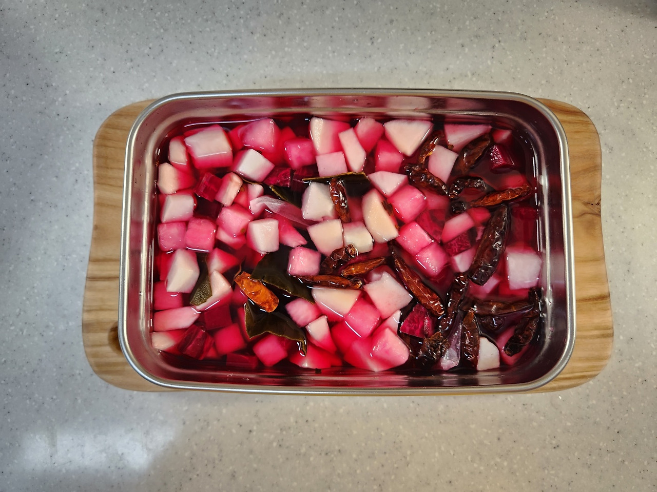 "당연히 채식이지, 무로 만들었는데." 남편이 치킨무 한봉지를 앞세우며 말했습니다. 사실 저희 남편은 9년 전부터 조그만 닭강정 가게를 운영해오고 있는데 최근들어 매출이 급감하면서 급기야 유통기한이 임박한 치킨무를 집으로 실어나르고 있죠.