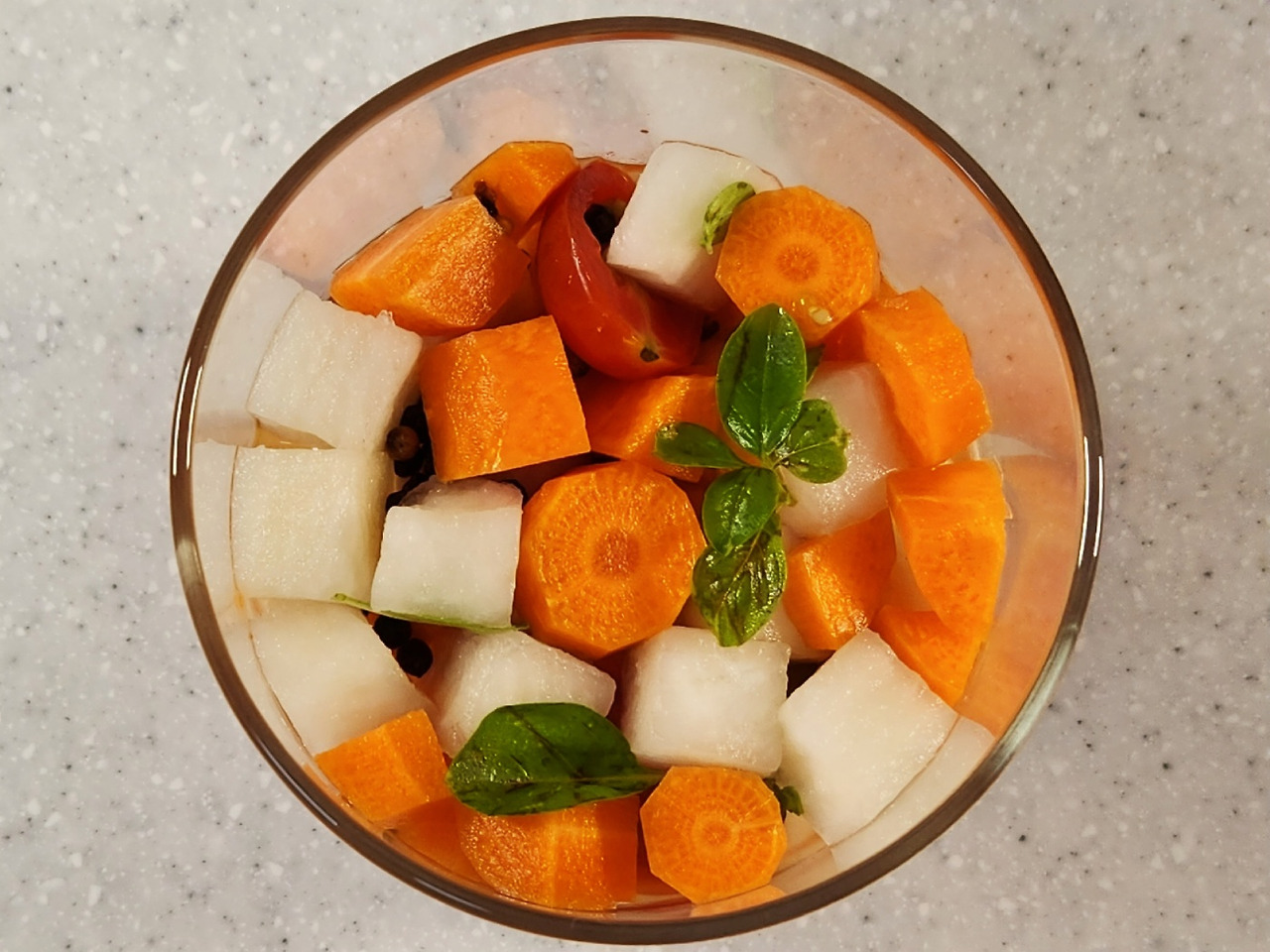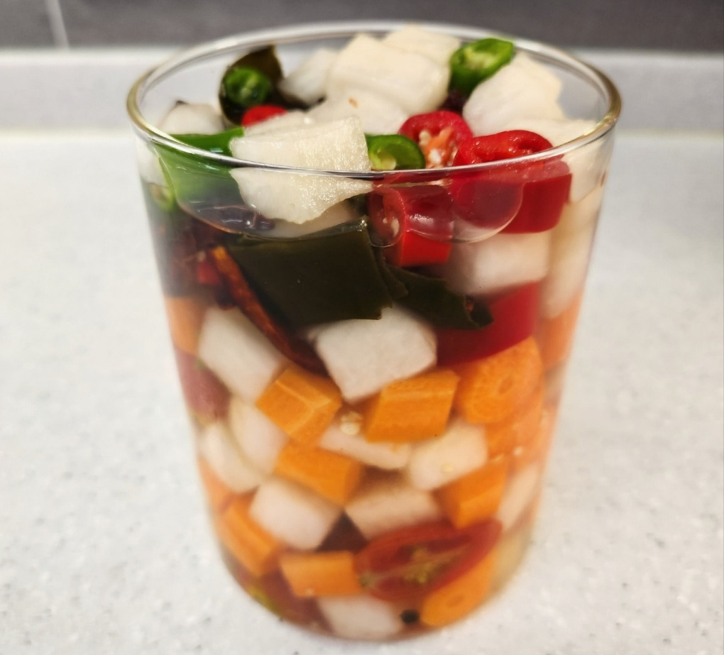 팔 수도 없고, 버리에도 아까우니 집으로 가져오는 걸 이해하지만 냉장고에 쌓여만 가는 치킨무는 어쩌라고! 불만가득한 저의 표정을 보던 남편은 '요리연구가'라 부르며 제 기분을 띄워주기 시작합니다. 치킨무는 채식일까? 아닐까? 란 불편한 질문을 던진 건 불편한 심기를 전달하기 위함이었는데 말이죠.