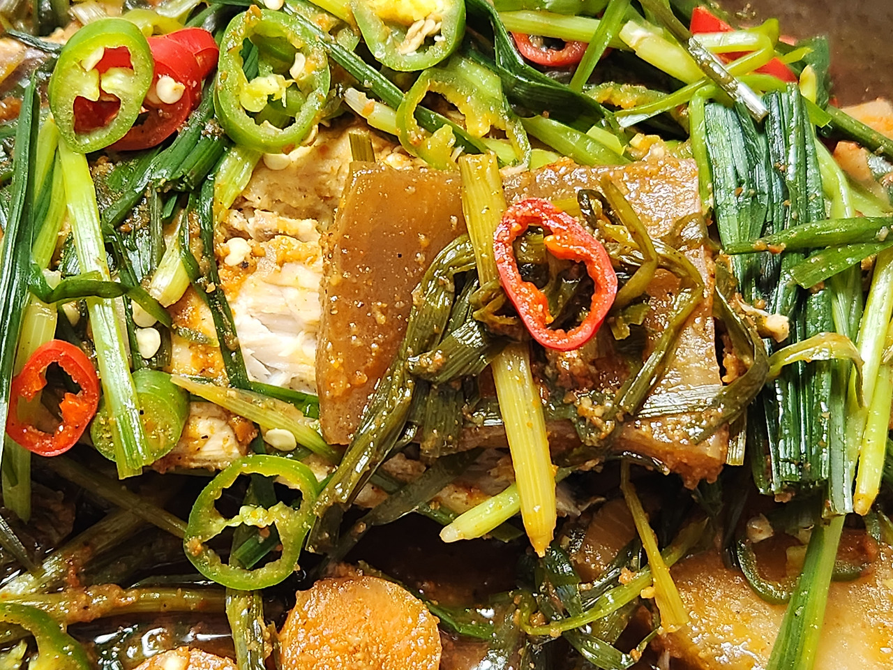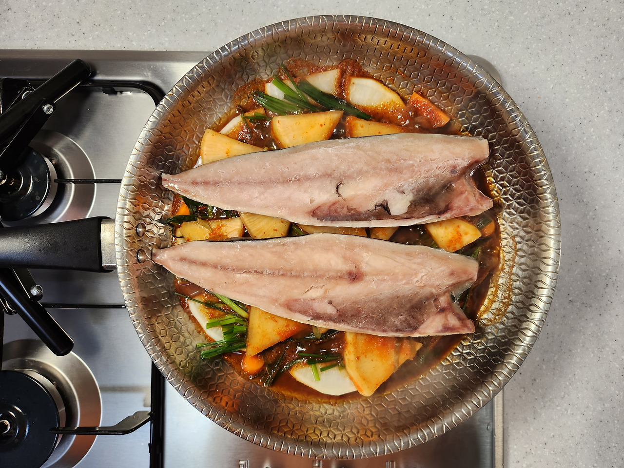 무김치가 살짝 익으면 냉동 고등어를 넣고 남은 양념장을 뿌려 준 다음 중불에서 10~15분 간 익혀줍니다. 먹기 전 마지막에 부추를 넣고 약불에서 10분 간 뜸을 들여주세요.