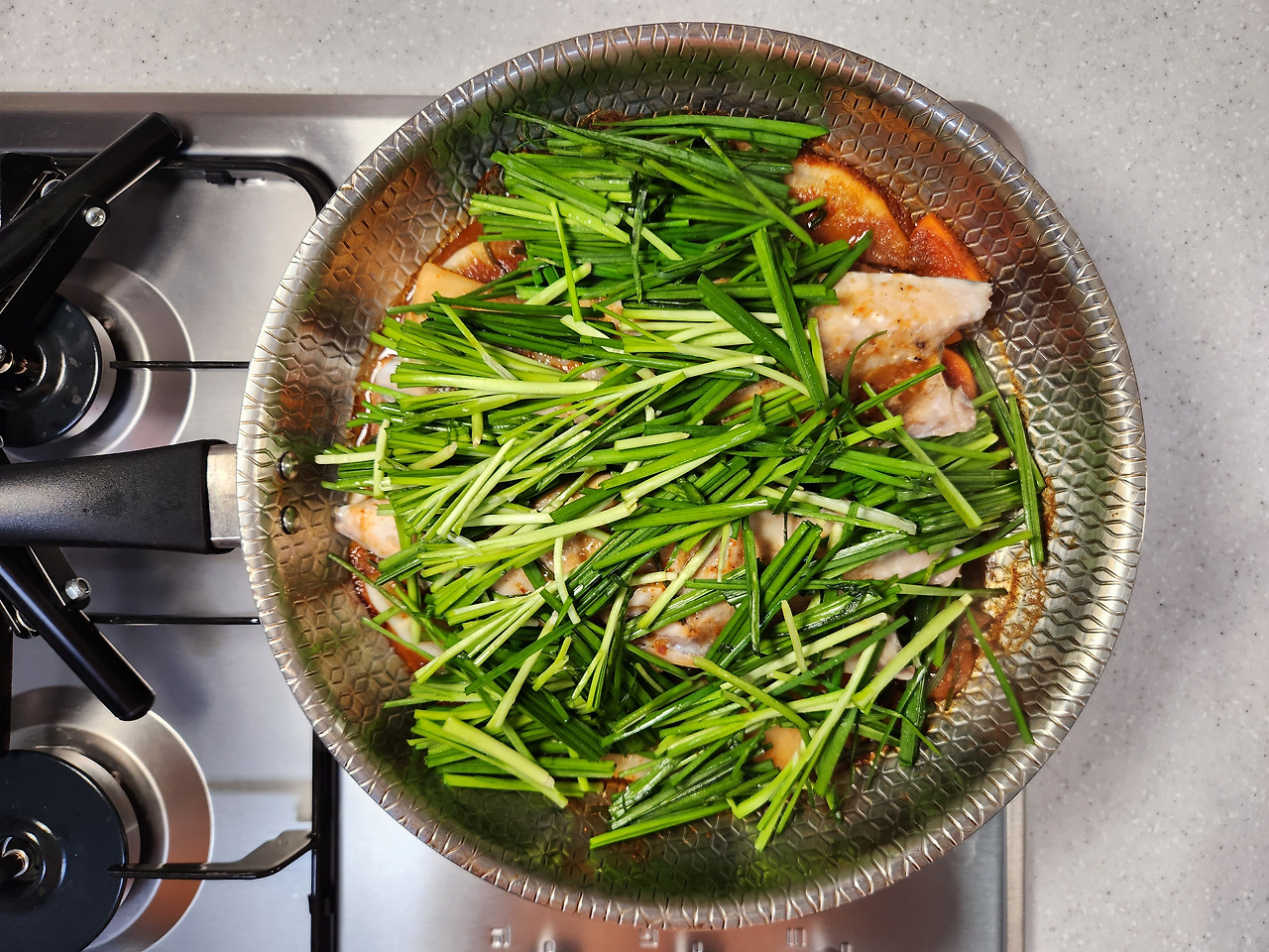 무가 살짝 투명해지면 부추 100g을 올리고 무김치를 깔아주세요. (무김치 대신 묵은지, 집에 있는 김치 넣으시면 되요.)